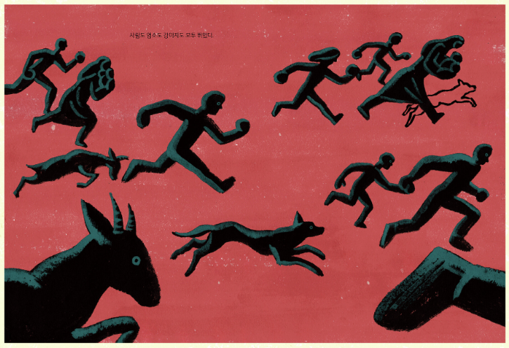 강렬한 붉은 바탕에 검은 빛으로 표현된 살기 위해 숨가쁘게 달리는 사람들과 동물들.