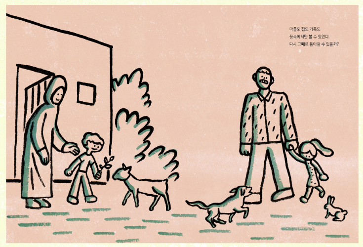 전시상황에서의 강렬한 색상과 대조적으로 꿈에 그리던 평화, 가족의 모습의 그림은 바라만 보아도 아련하게 느껴지지요.