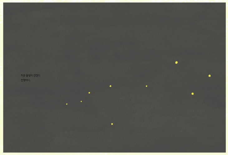 함께 있는 글을 읽지 않았다면 별자리인가? 반딧불이인가? 하며 보았을 장면이지만 이 장면은 전쟁의 모습을 나타낸 그림이었어요.