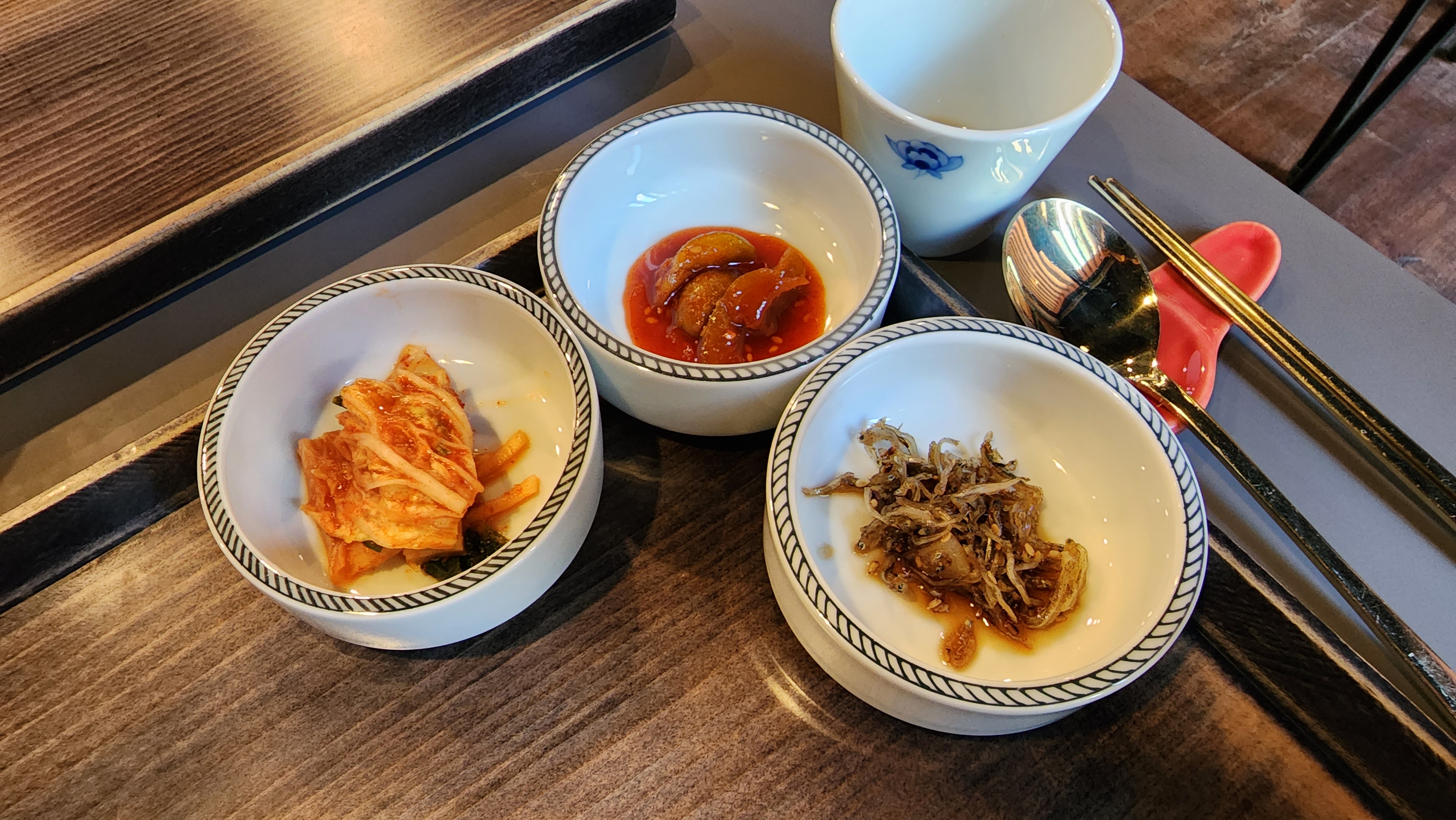 밑반찬으로는 김치, 멸치볶음, 매실장아찌가 나왔어요.