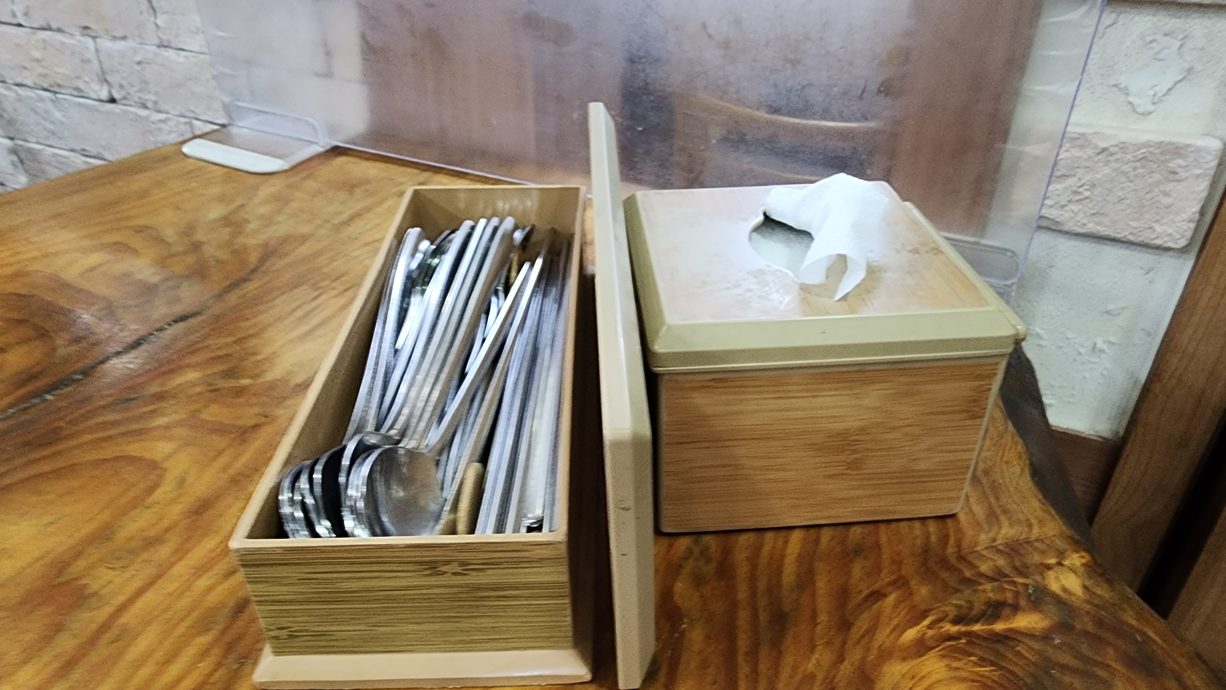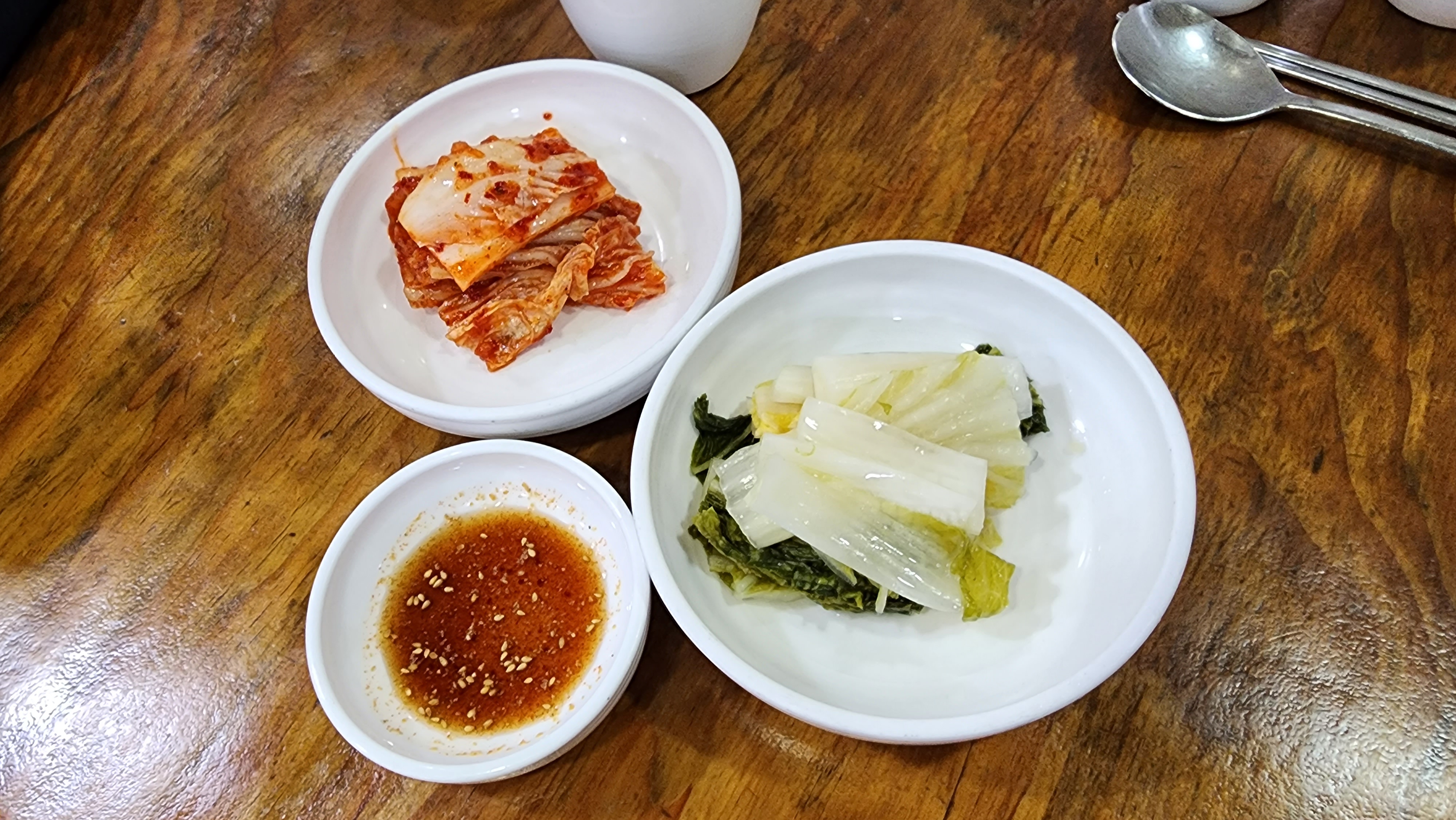생수, 컵, 식기, 냅킨등이 제공되고 밑반찬으로 김치와 백김치가 나와요.