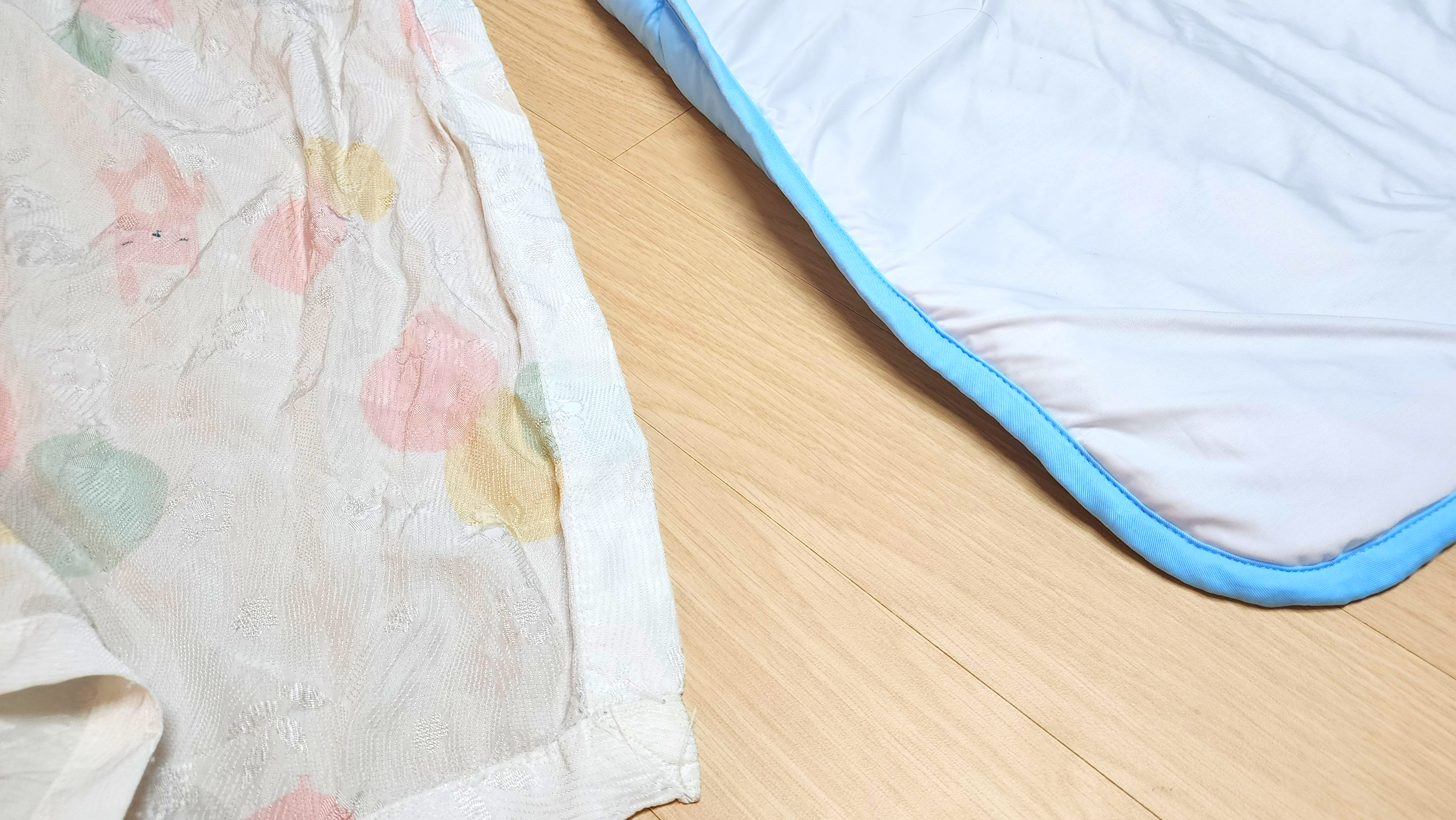 기존에 동글이가 덮고 자던 여름이불이 좌측이고 누잠 이불이 우측이예요.