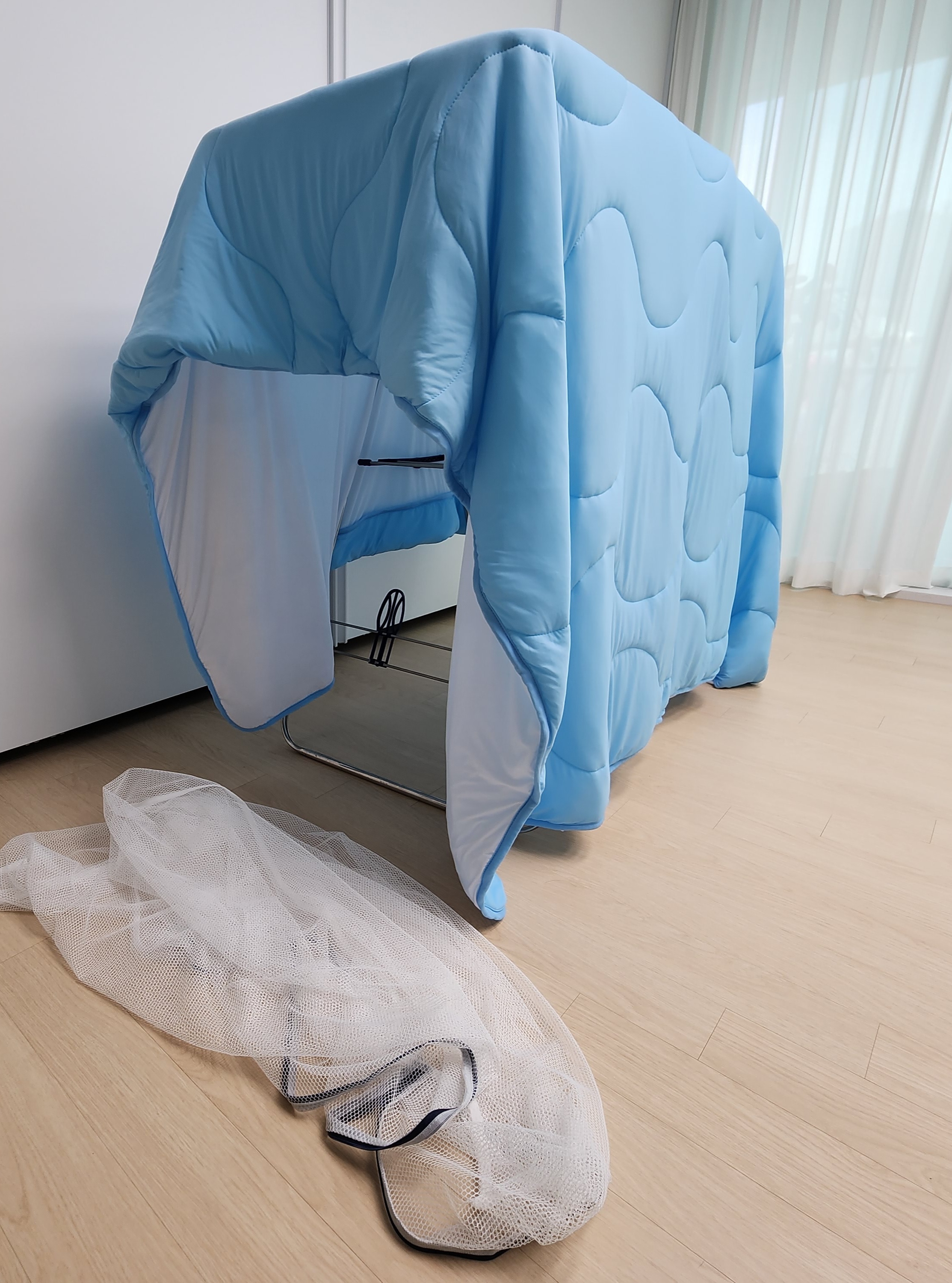 세탁이 끝난 이불을 꺼내서 건조대에 뉘어서 널었어요.