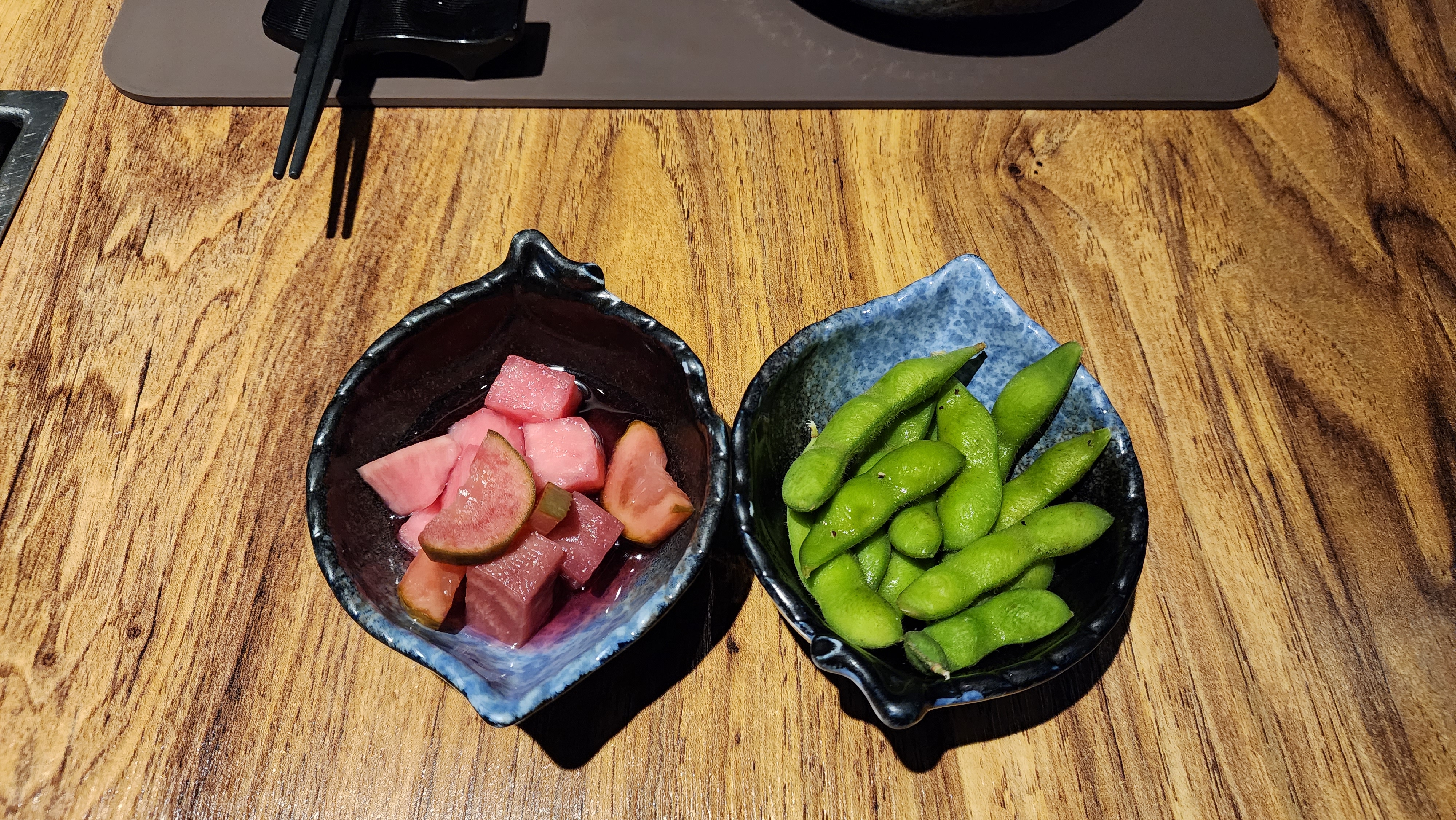 앞접시, 컵, 젓가락, 물, 피클, 완두콩 등이 미리 준비되어있더군요.