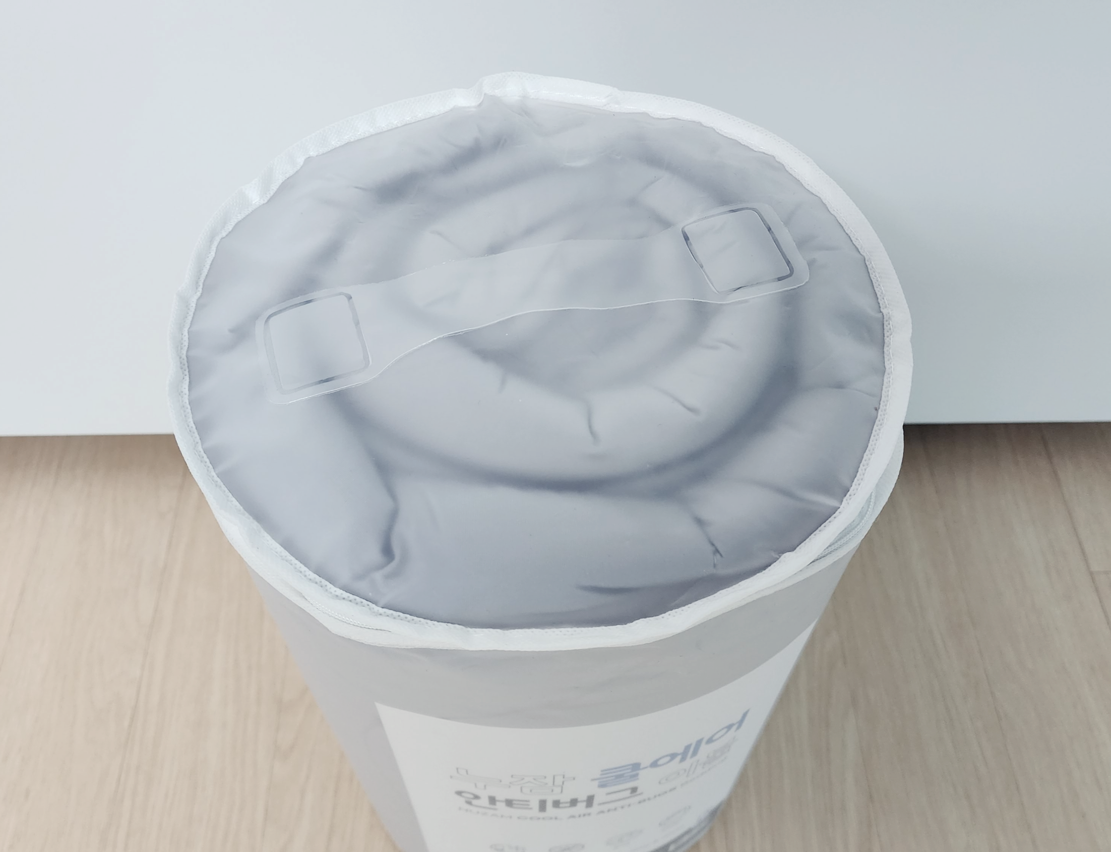 비닐재질의 가방이라 젖거나 오염될 걱정을 덜 수 있었고, 이불을 넣고 빼기 좋더라구요.