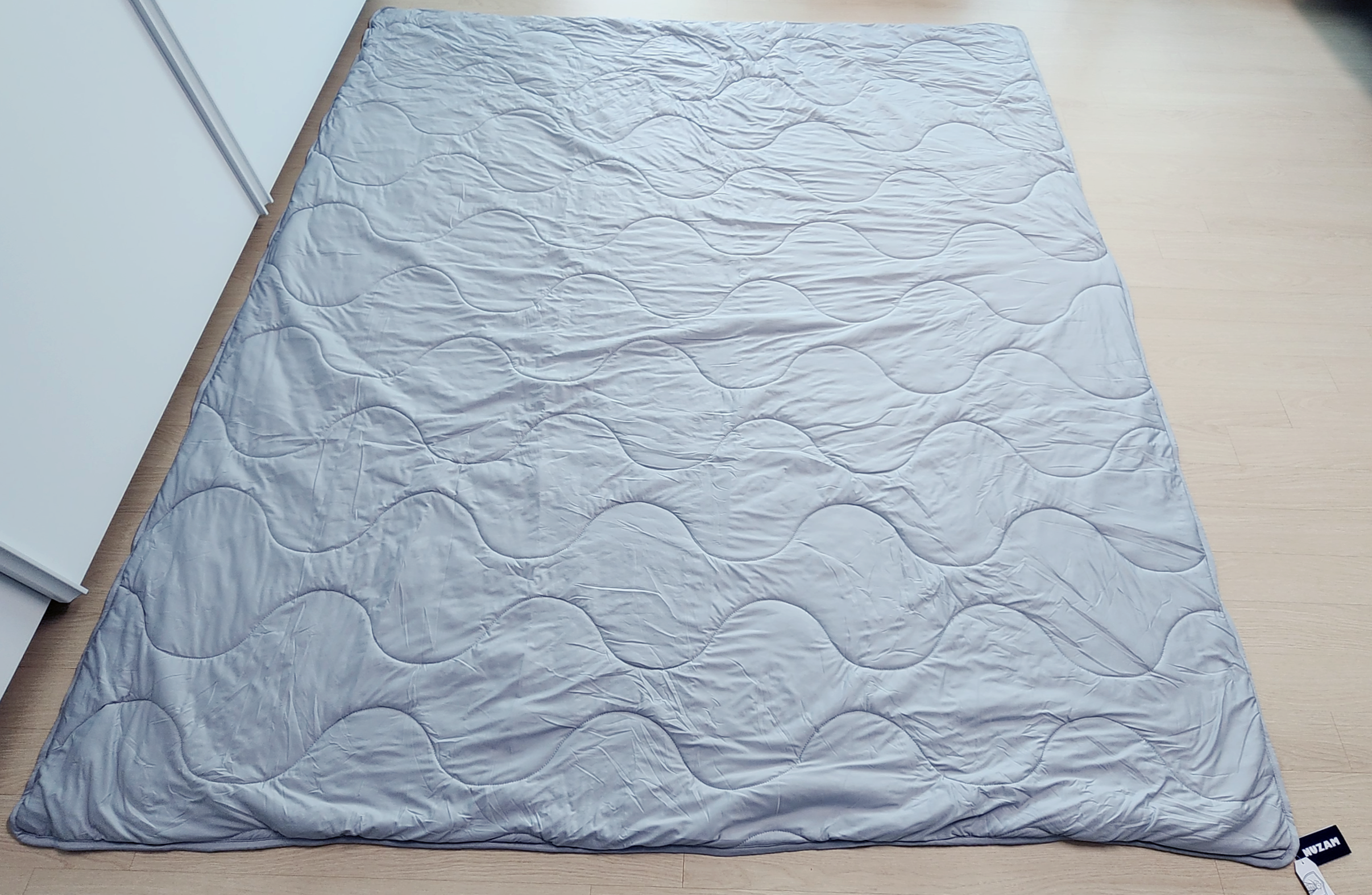 누잠 토퍼에 누잠 방수커버 씌운 위에서 누잠 쿨에어 안티버그 이불 덮고 노는 동글이예요.