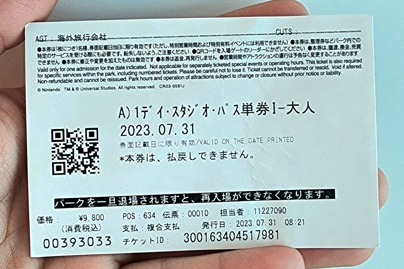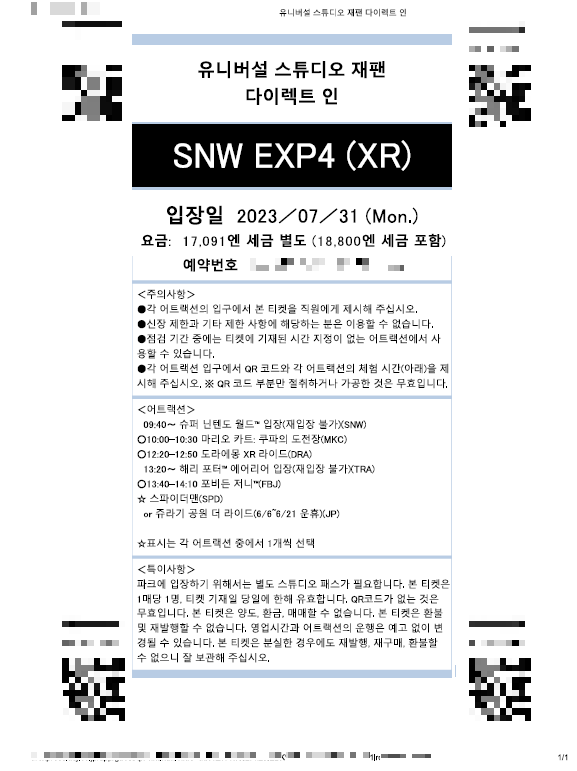 어트랙션은 마리오카트:쿠파의도전장, 도라에몽XR라이드, 포비든저니, 스파이더맨이나 쥬라기공원 더 라이드 를 탈 수 있고 슈퍼닌텐도월드 확약권 및 해리포터 에어리어 입장 확약이 포함되어있는 티켓이었어요.