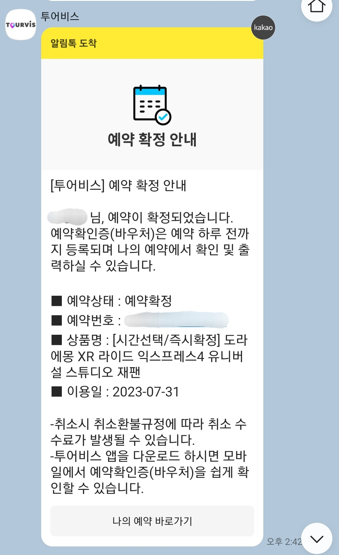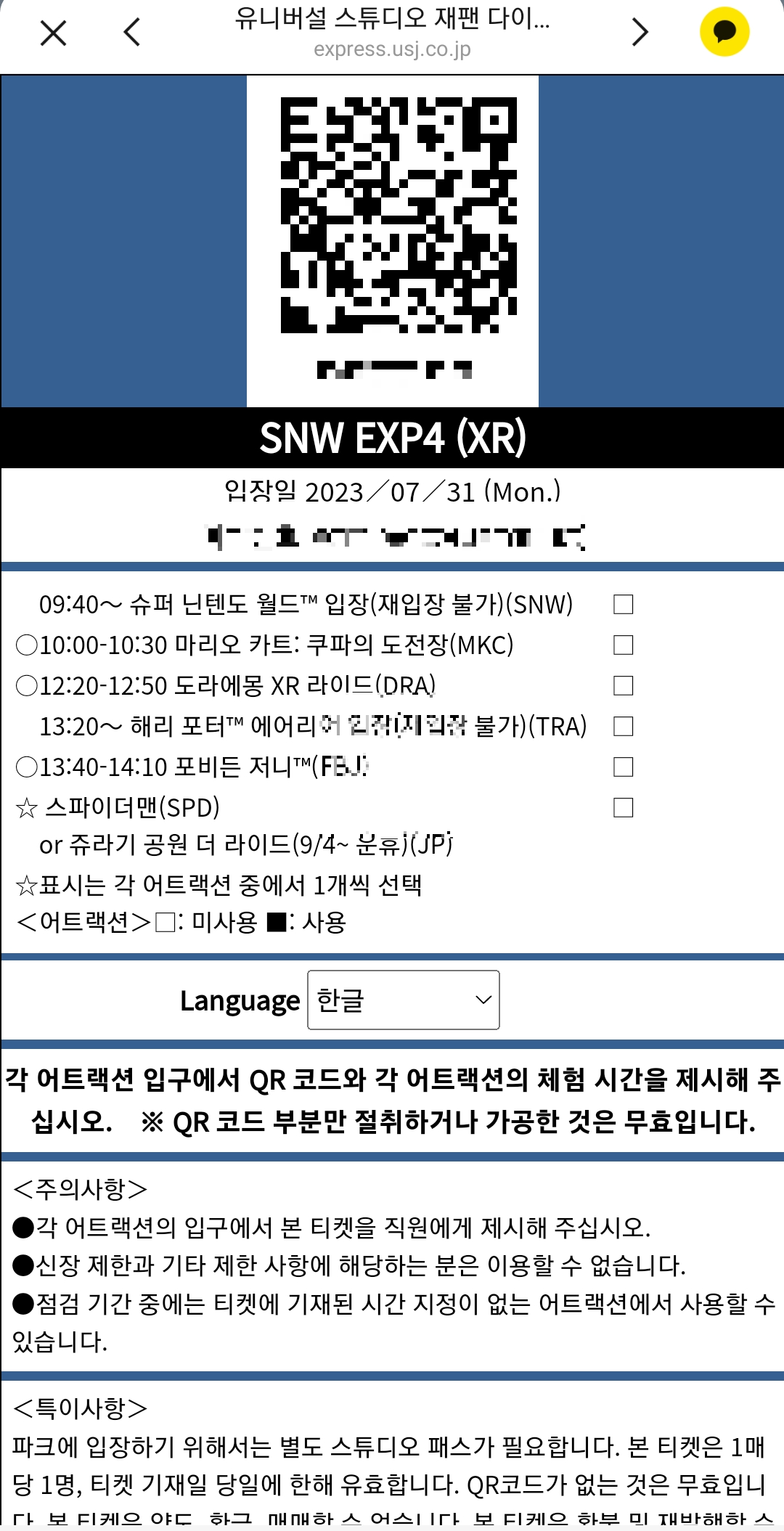 인쇄화면을 출력도 해서 가져갔고 분실 할까봐 이미지를 휴대폰에도 담아갔었는데요 인쇄본이나 모바일 이미지 모두 어트랙션 입장이 가능했어요.