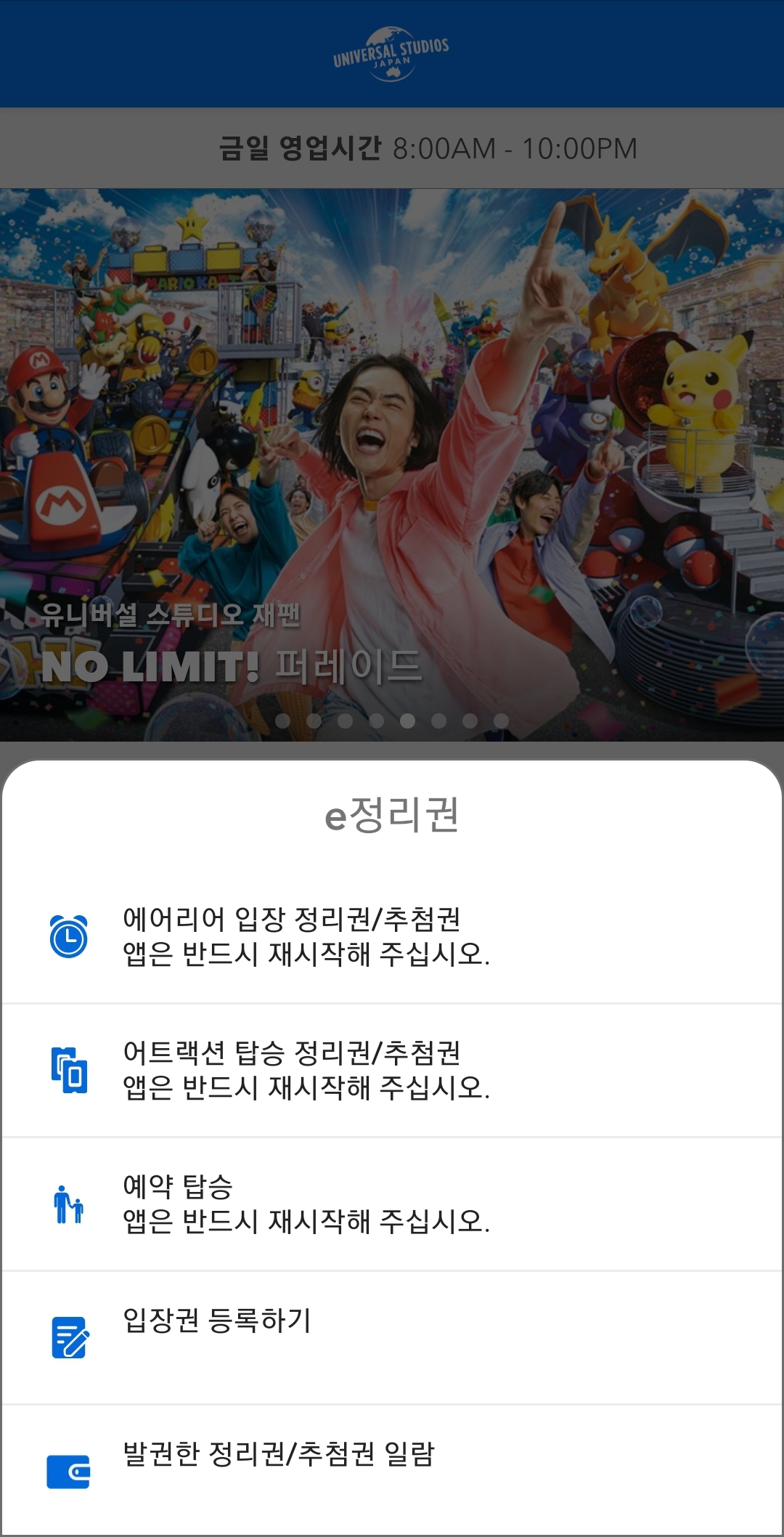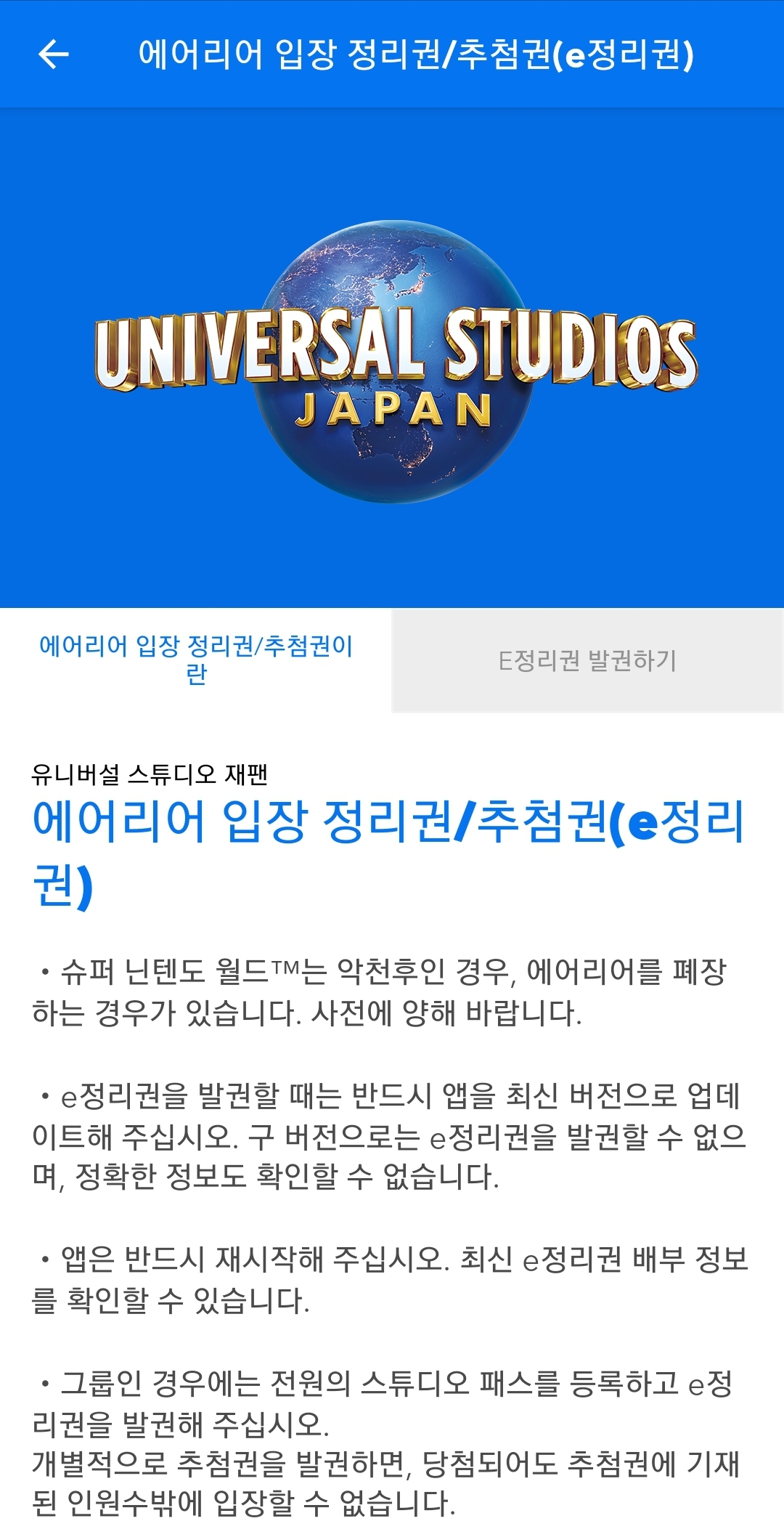 USJ 입장 후 입장권을 어플에 등록한 뒤 정리권 발권을 하셔야 해요.