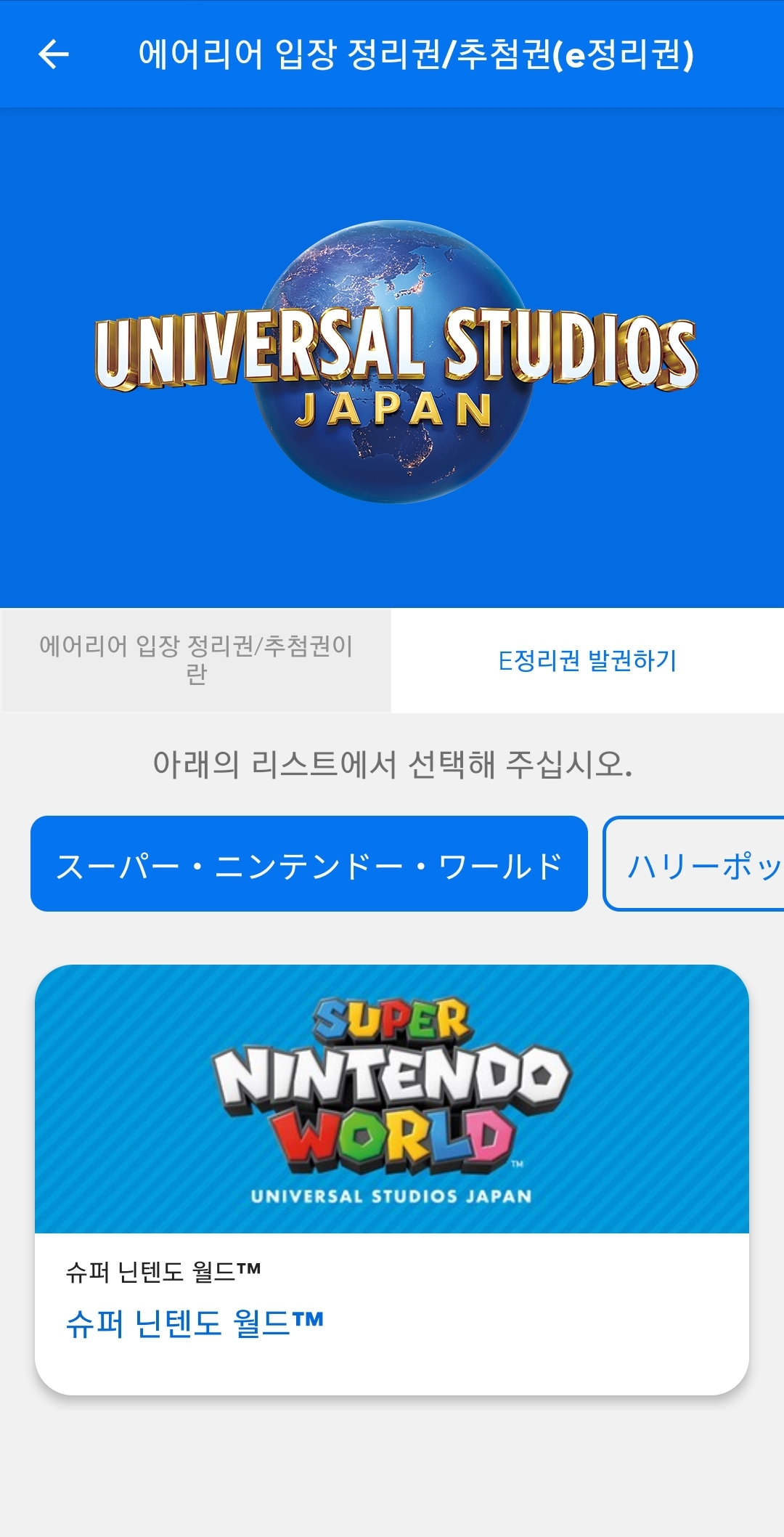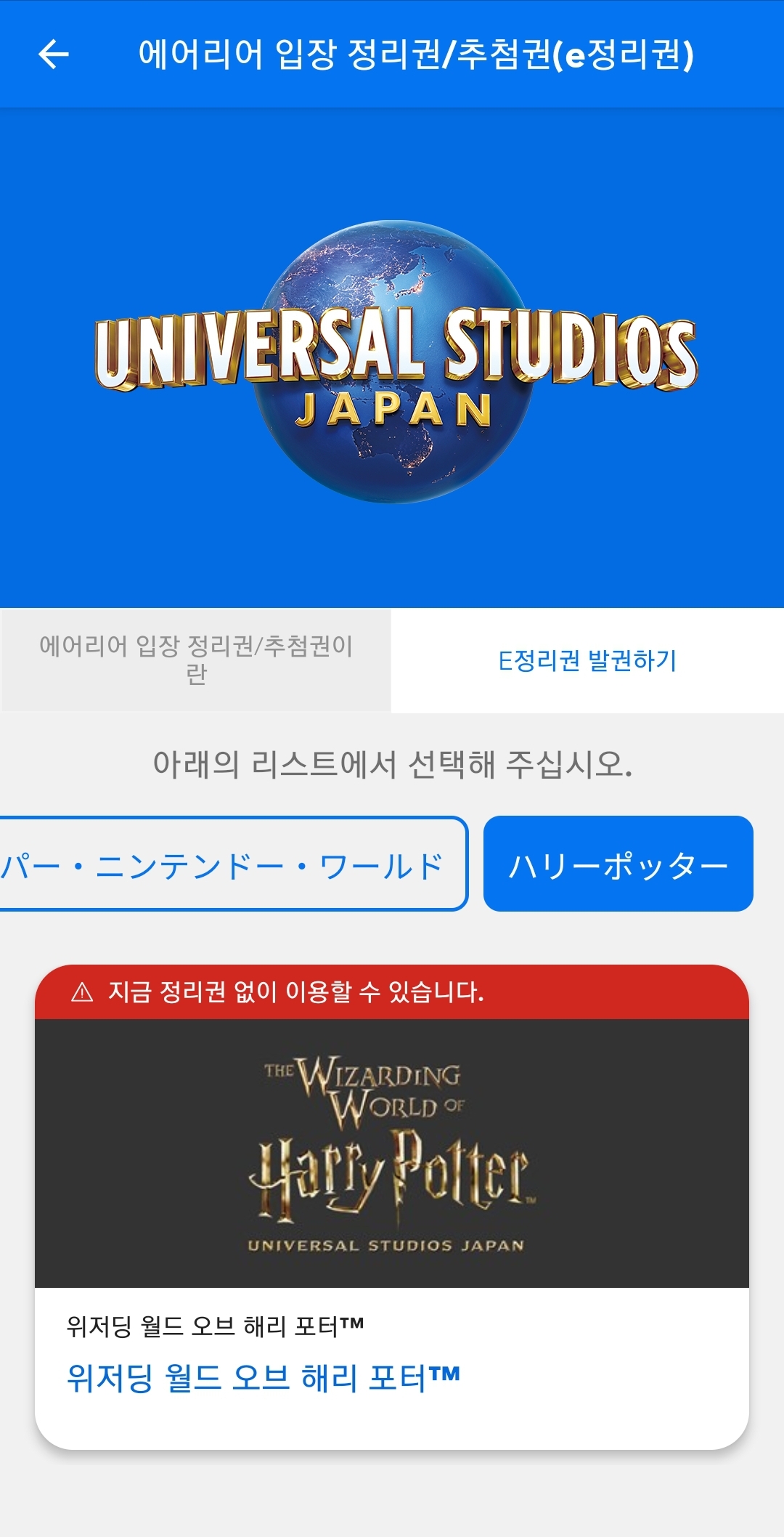 여기서 정리권은 특정 구역에 입장 가능한 시간대를 예약할 수 있는 패스인데 USJ 입장 후 어플에서 획득하실 수 있어요.(USJ 밖에서는 정리권 발권이 안되요)