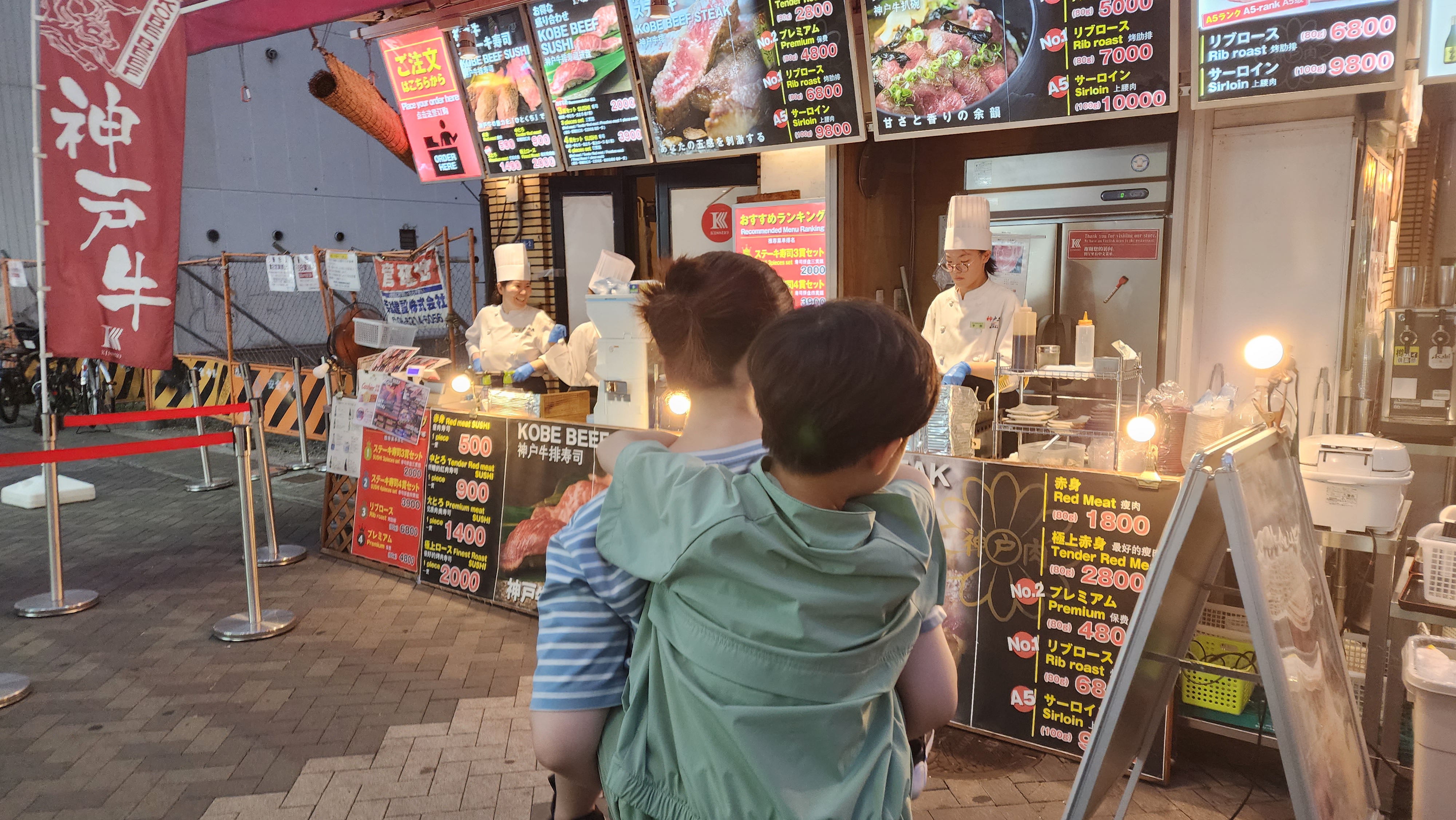 지금 보시는 사진은 다리아프다고 징징대는 동글이를 업고 있던 제 모습인데요, 더 멀리 가기도 힘들고 소고기 사진이 보여서 식당에서 앉아서 소고기나 먹자고 들어간 곳이 와노미야 고베 비프 입니다.