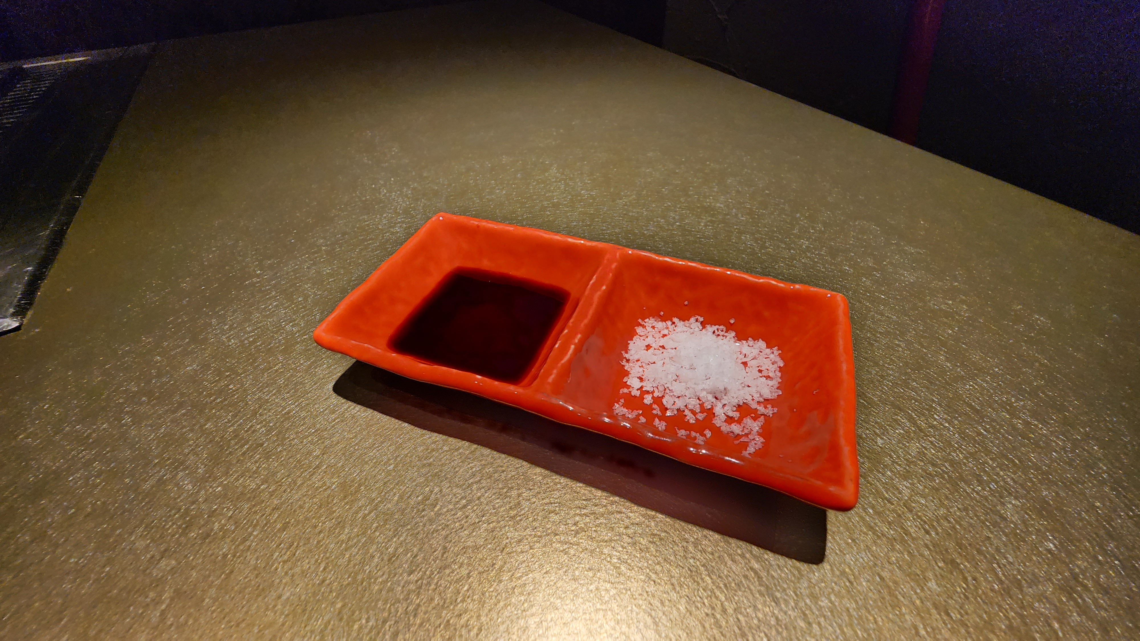 자리에 앉으니 앞치마, 젓가락, 간장과 소금, 물수건을 가져다 주셨어요.