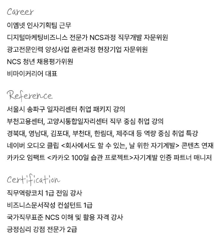 직무역량전문코치라는 직업 자체가 저한테는 조금 생소했었는데요, 이 분의 이력을 보니 어떤 코칭을 해주실지 감이 오더라고요.