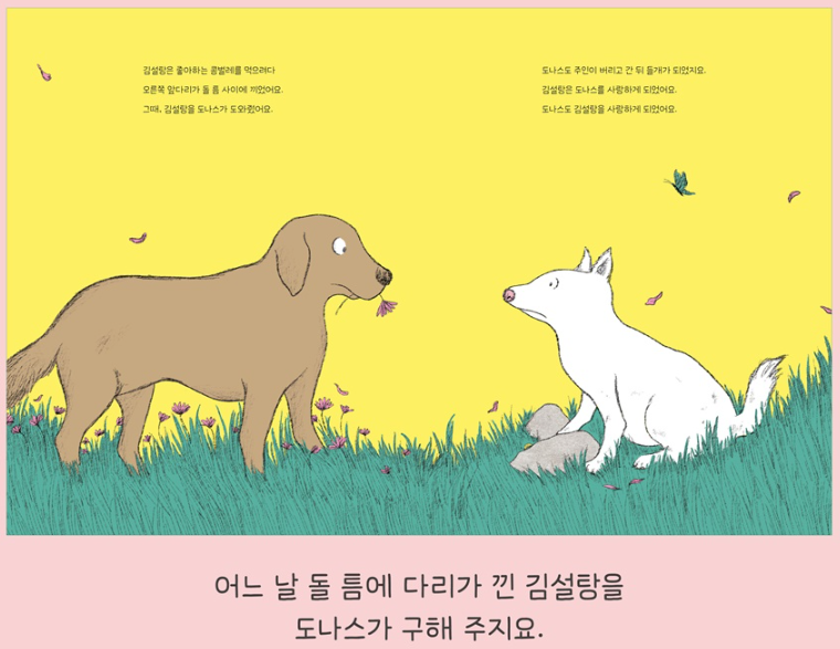 그런데 표지를 보니 노란 바탕에 커다란 갈색 개가 하얀 개를 안아주고 둘레에 꽃으로 장식 되어있는 그림에서 어떤 이야기가 펼쳐질지 짐작도 안되더라구요.