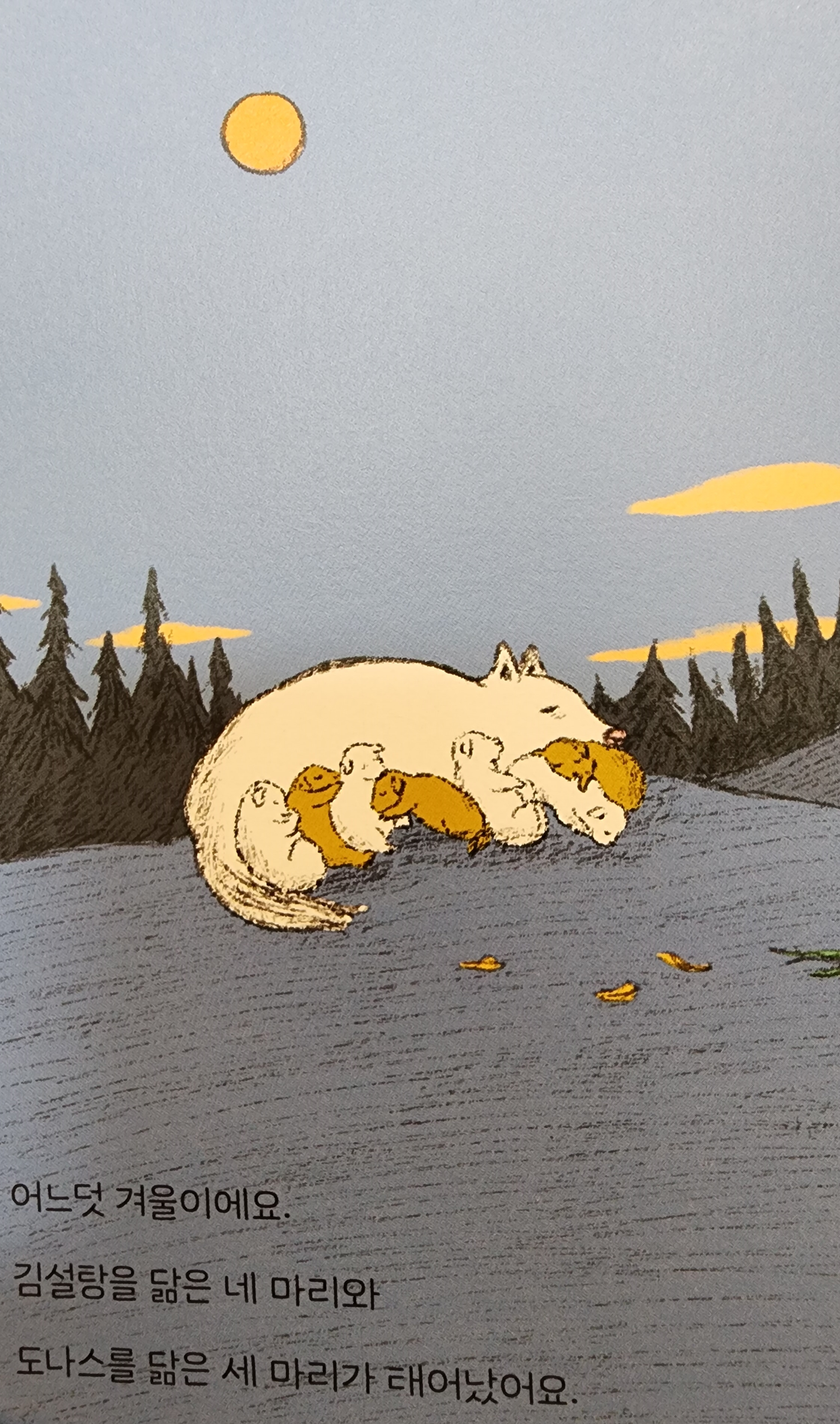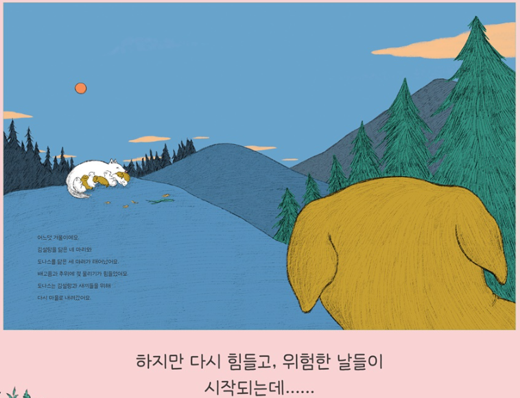 김설탕을 닮은 강아지와 도나스를 닮은 강아지 일곱 마리를 살리기 위해 아빠가 된 도나스가 다시 마을로 내려가게 되었어요.