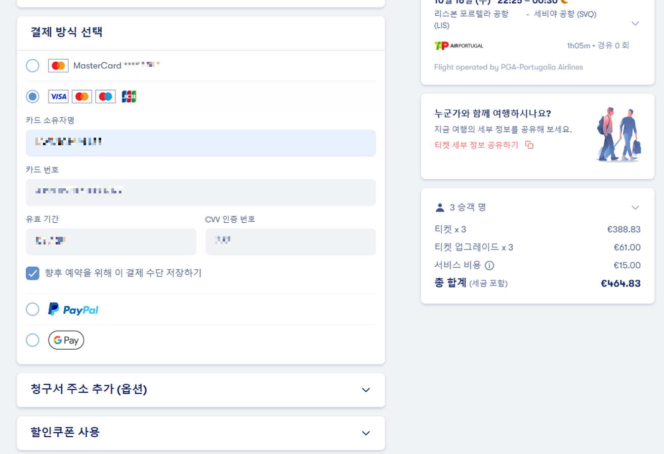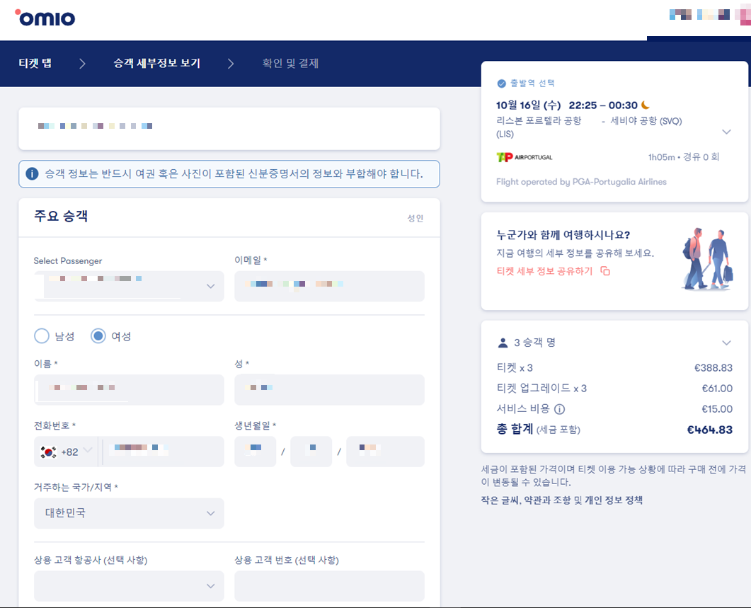 오미오에서 승객 세부정보 입력해서 항공편을 예약하지만 체크인할 때 에어포르투갈 홈페이지에 가서 또 입력하셔야해요.