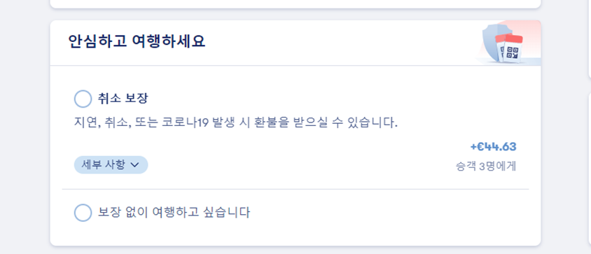 제가 지난번 부엘링 항공 결제하면서 취소보장 결제도 했었는데요 굳이 해야하나 싶어서 보장없이 여행하는 옵션으로 진행했어요.