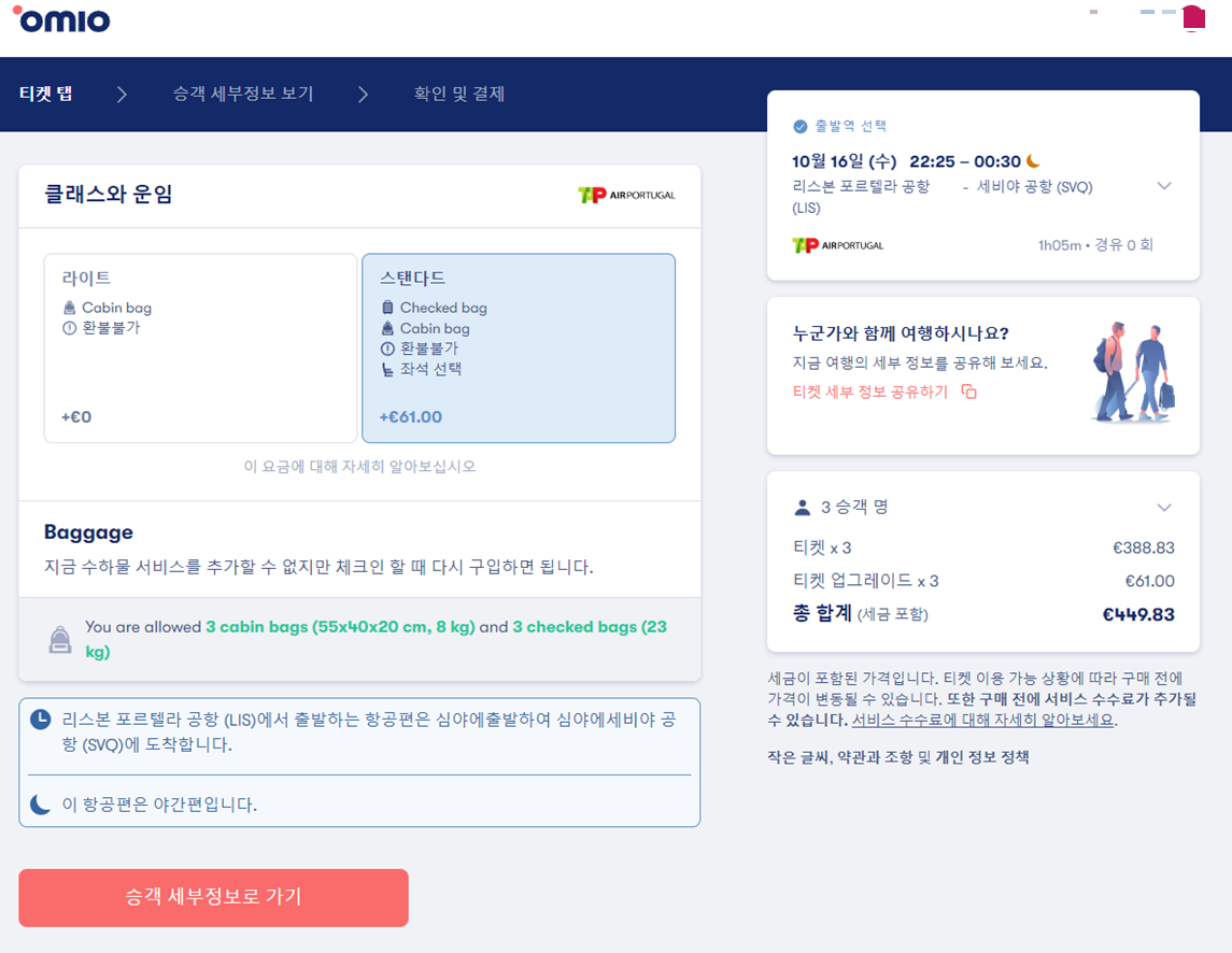 저는 짐을 부쳐야 하는 상황이라 스탠다드 체크했더니 1명당 61유로가 더 추가되더라구요.