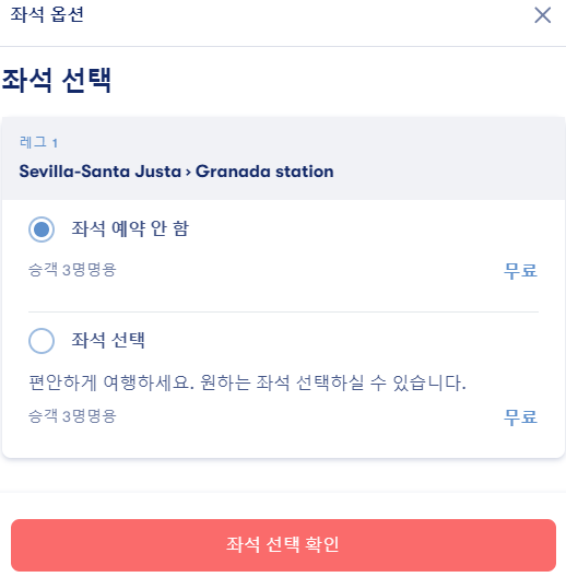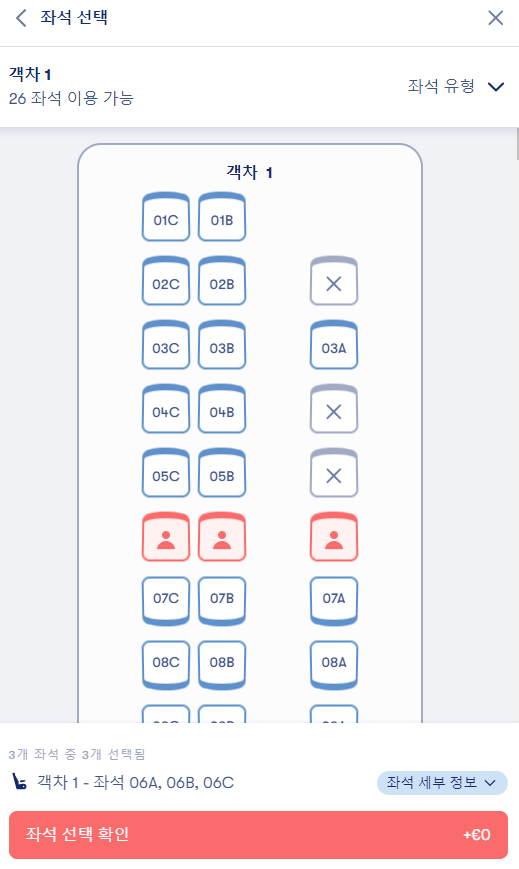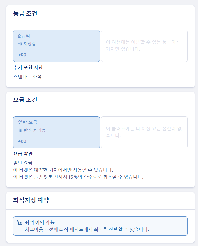 기차 등급 조건이 있던데 저는 2등석만 여석이 있는 기차를 예매했어서 선택의 여지가 없었고요 좌석 지정 예약이 가능해서 좌석도 골랐어요.