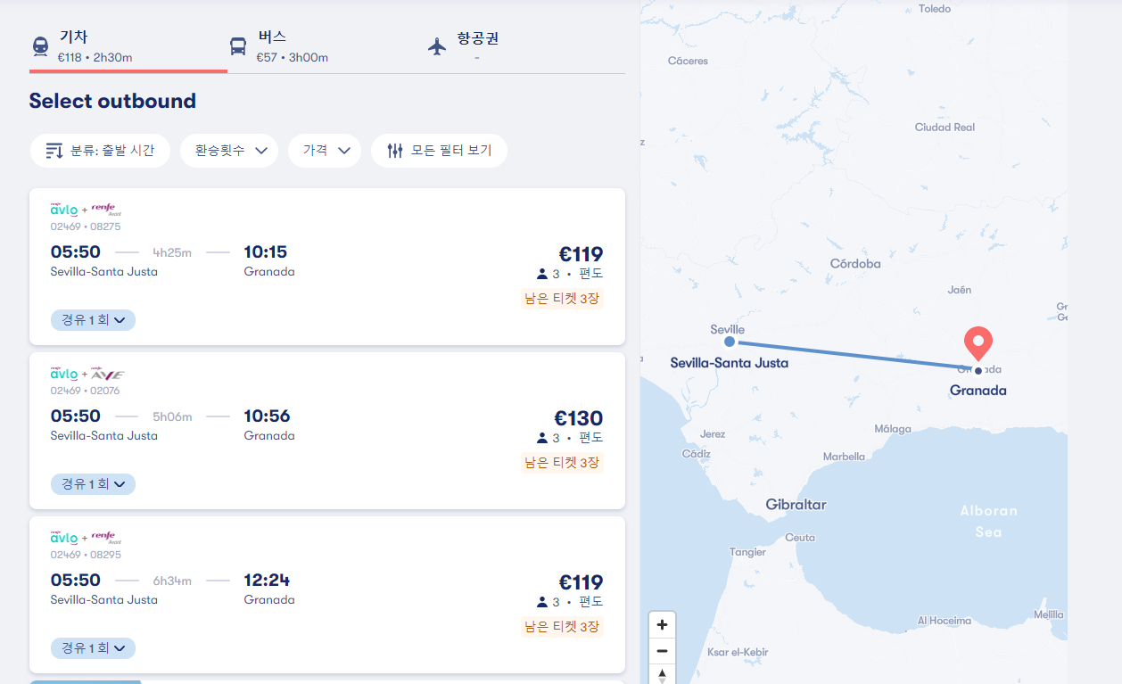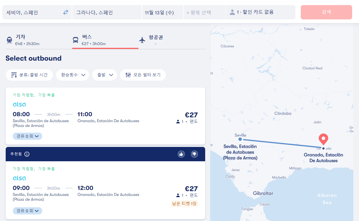 오미오에서 세비야-그라나다 가는 방법에 대해 검색해보면 버스가 최적으로 나와요.