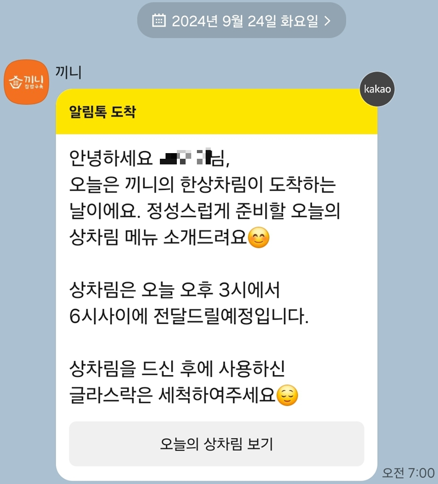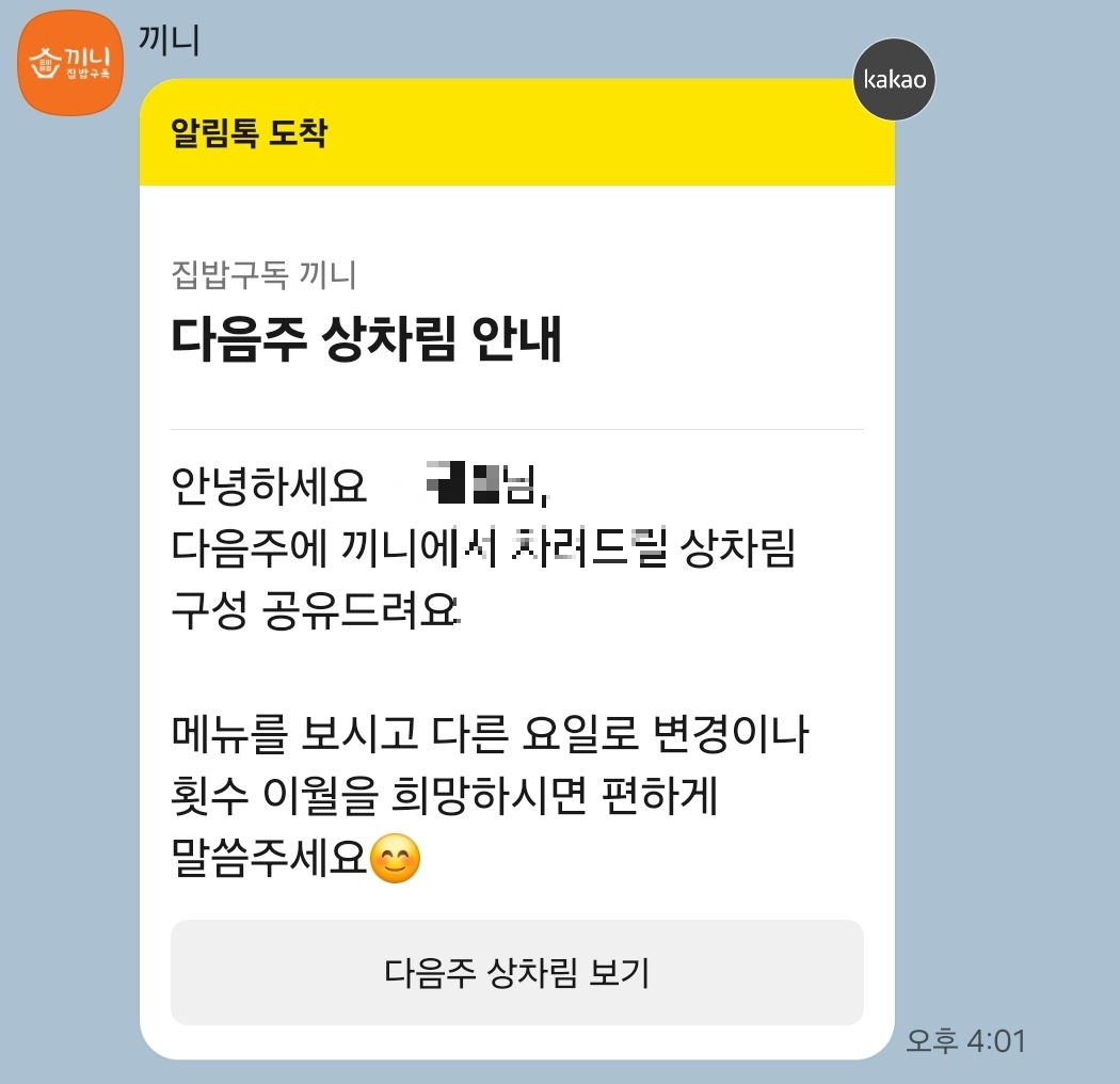 동글이랑 저는 다음주 상차림 같이 보는걸 좋아하는데요, 아이랑 같이 보면서 더 맛있어 보이는 반찬이 배송받는 날짜가 아닐 때는 미리 톡으로 요일 변경을 요청해서 받아봤어요.