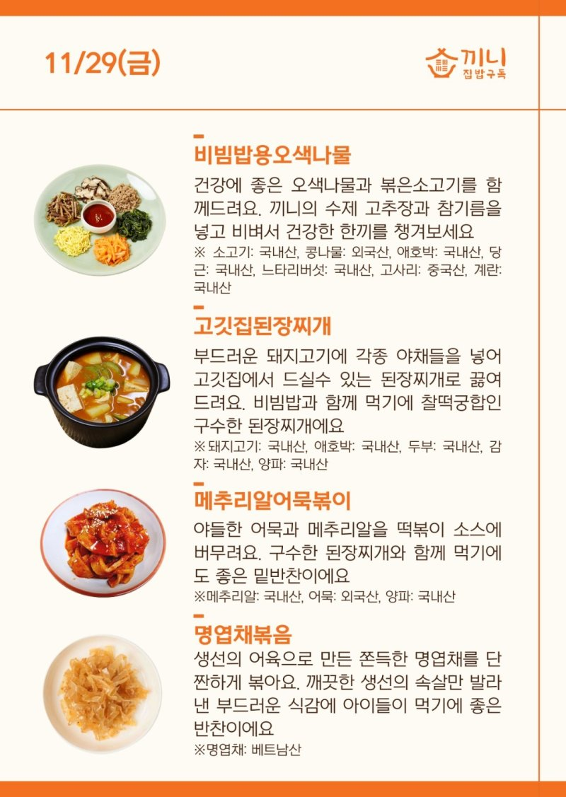 - 일단 아이가 잘 먹고 맛있어요. 반찬 디테일을 살리시는게 느껴지는게 콩나물국 하나를 끓여도 재첩을 넣는가 하면 생선구이에 레몬을 곁들여주고, 라자냐 메뉴가 나왔을 때는 집에서 데워 먹었을 때 맛있으라고 피자치즈는 조리하지 않고 뿌려만 놓는 그런 센스가 돋보이더라구요.