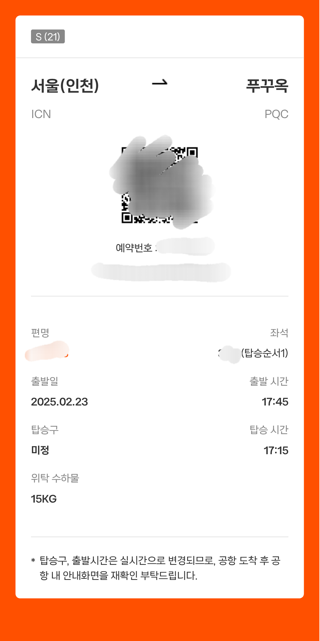 모바일 탑승권은 탑승 24시간 전에 가능해서 카톡으로 모바일 탑승권 발급하기 안내 톡이 오자마자 좌석 선택해 모바일 탑승권을 발급했어요.