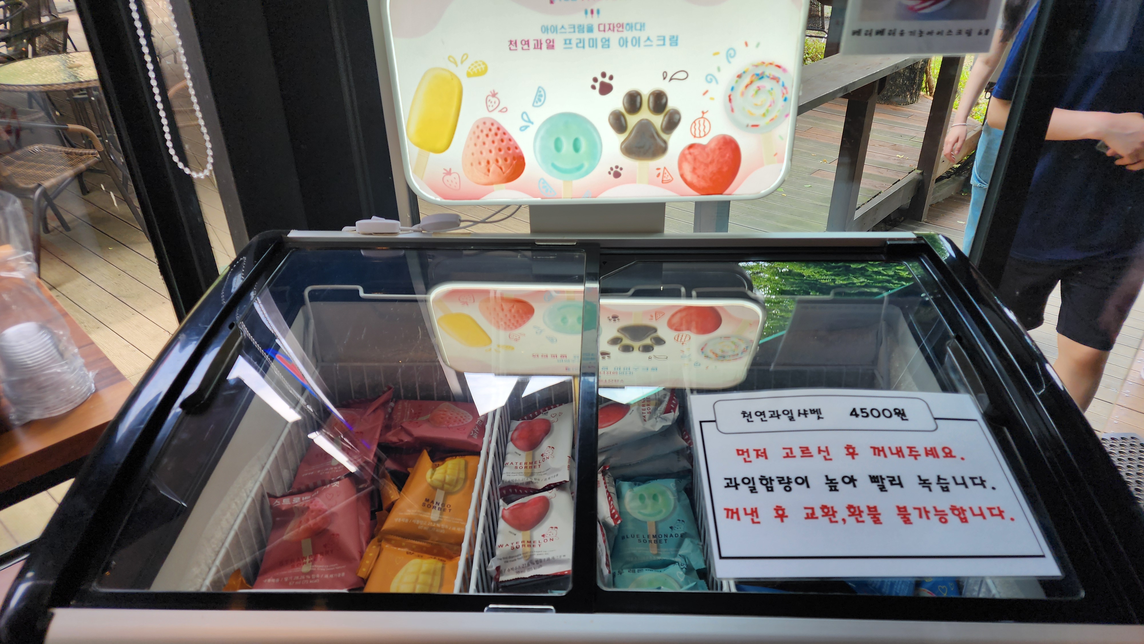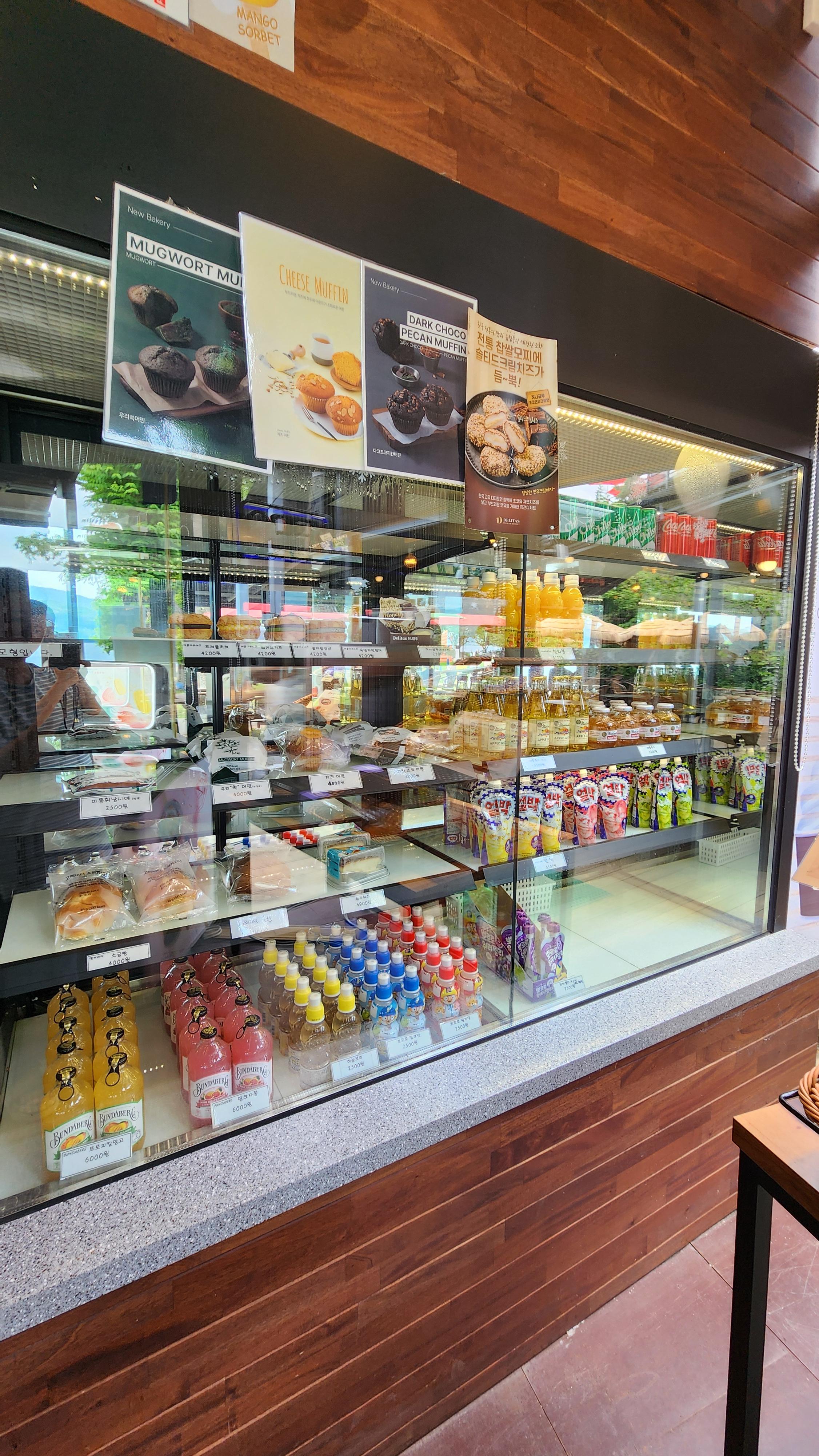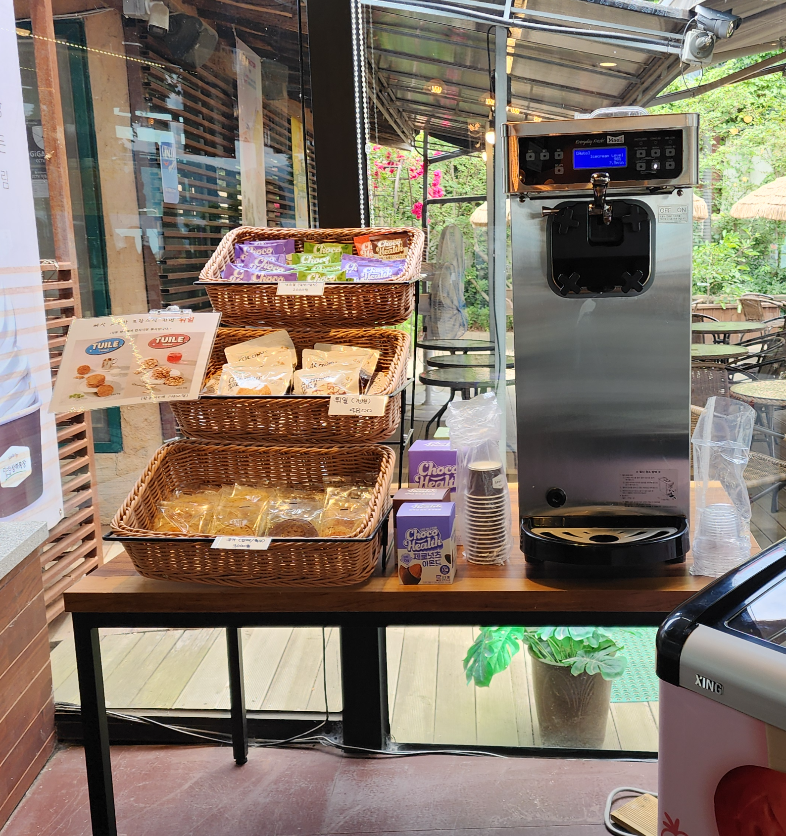 쇼케이스에 어린이음료부터 병음료, 다쿠아즈, 휘낭시에 등 베이커리 메뉴도 있었고, 튀일과 상하목장 아이스크림 기계도 있었고요 천열 과일 샤벳도 판매중이었어요.