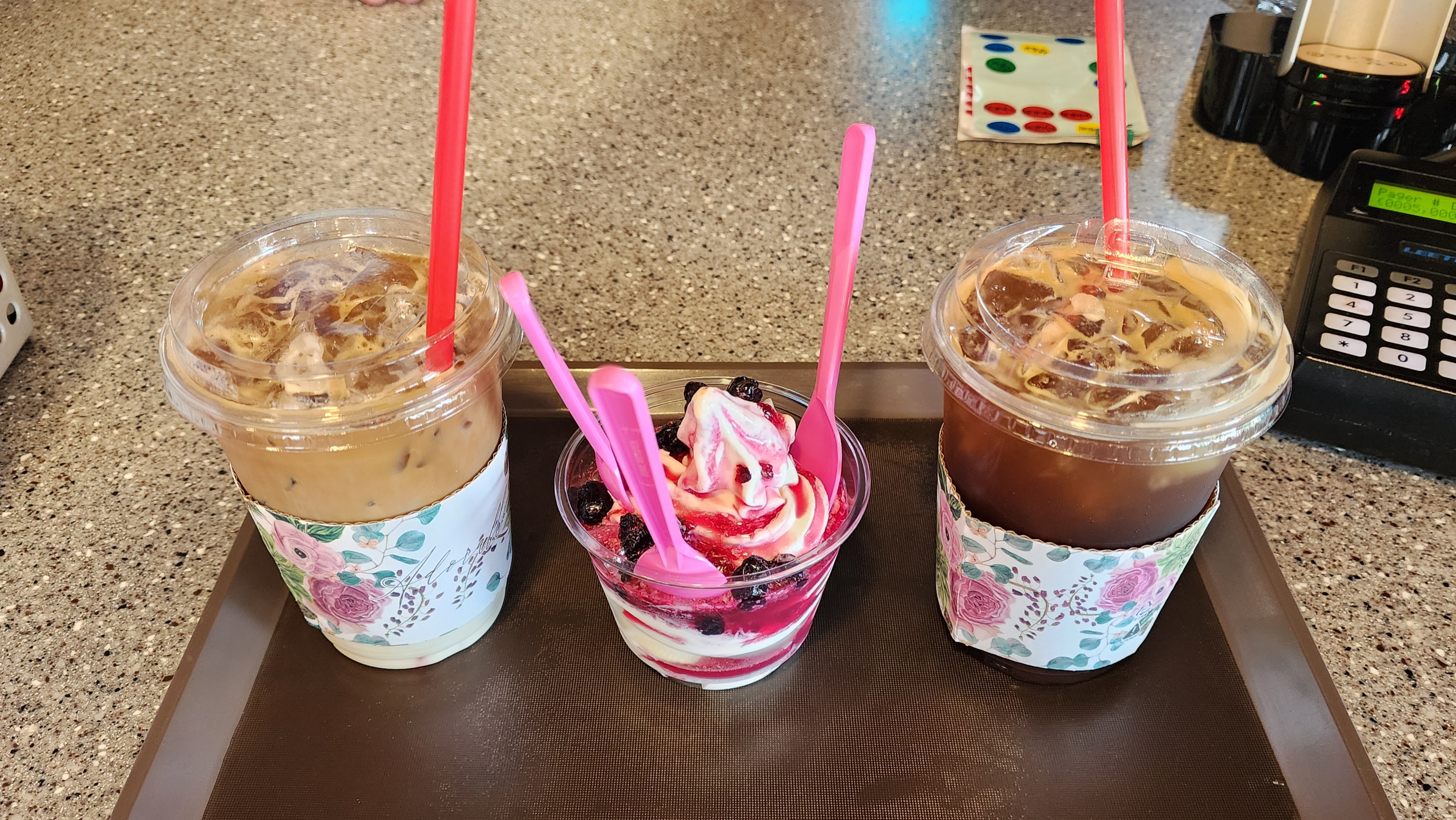 수제차, 아이스크림, 커피 등의 메뉴가 있었는데요 아이스라떼, 아이스 아메리카노, 블루베리 라즈베리 유기농 아이스크림을 주문했어요.