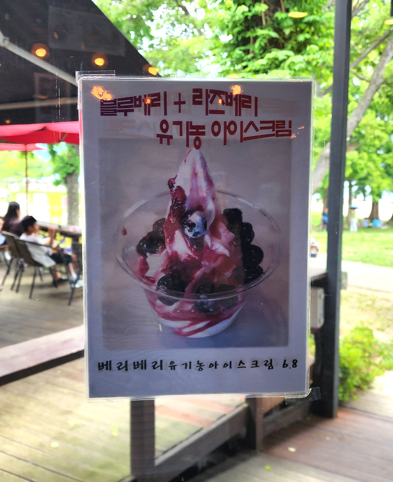 블루베리+라즈베리 유기농 아이스크림 이름이 엄청 긴데요 이 비주얼에 동글이가 혹 해서 카페에 간거라 마케팅엔 성공하신 듯 해요.