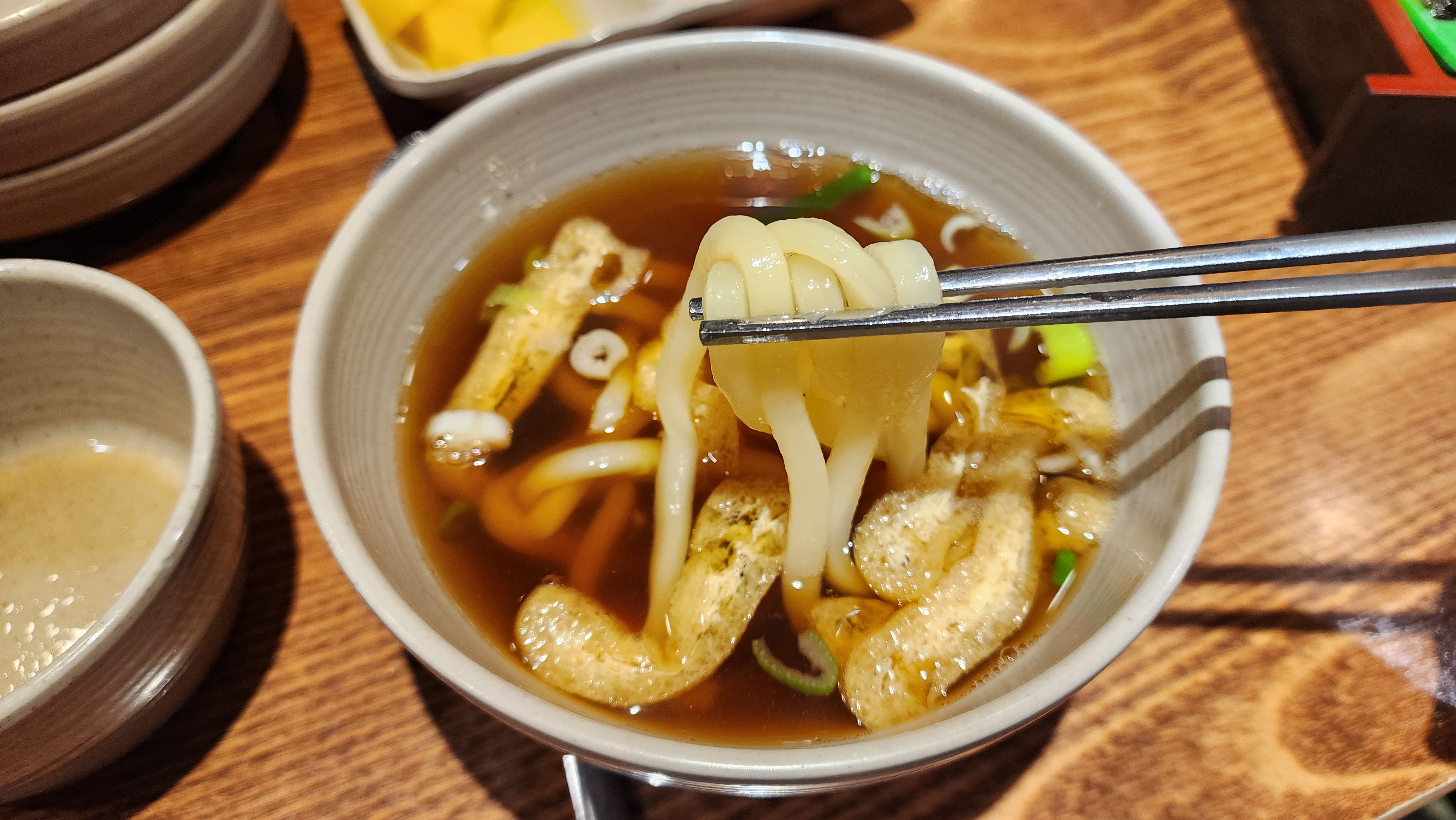 우동도 나왔는데요 유부와 맛살이 고명으로 들어간 평범한 우동이었어요.