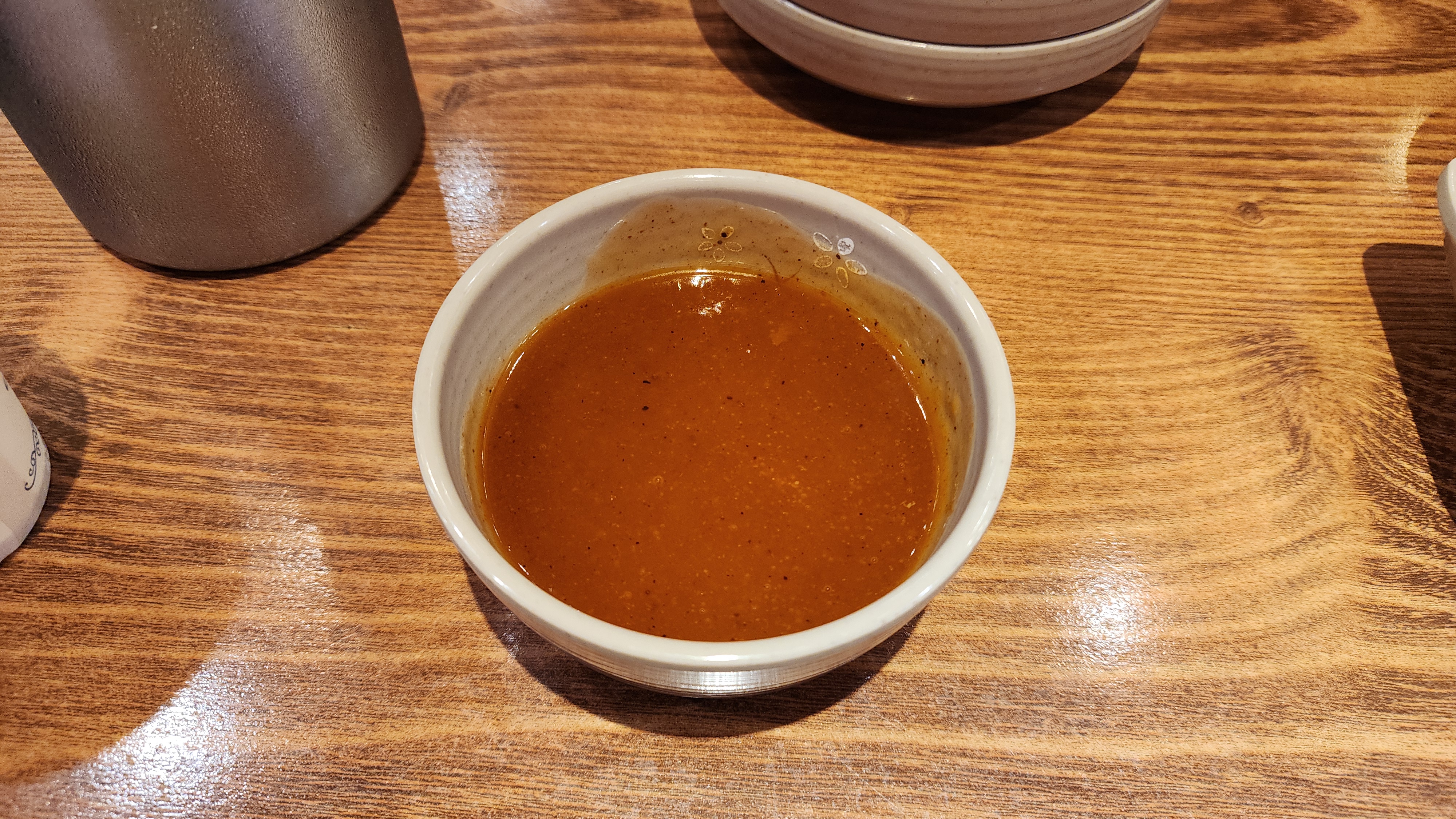 매콤돈까스 소스는 살짝 주황빛이 도는 갈색이었는데 살짝 칼칼한 맛이 돈까스의 느끼함을 잘 잡아주더라고요.