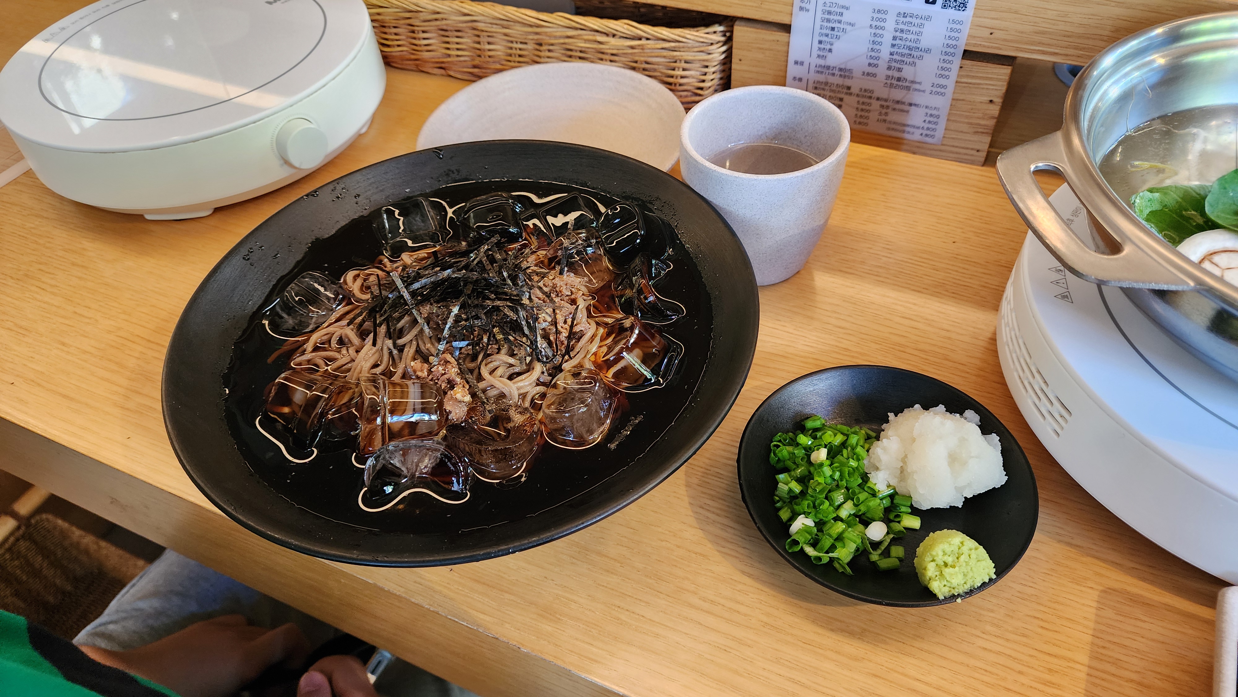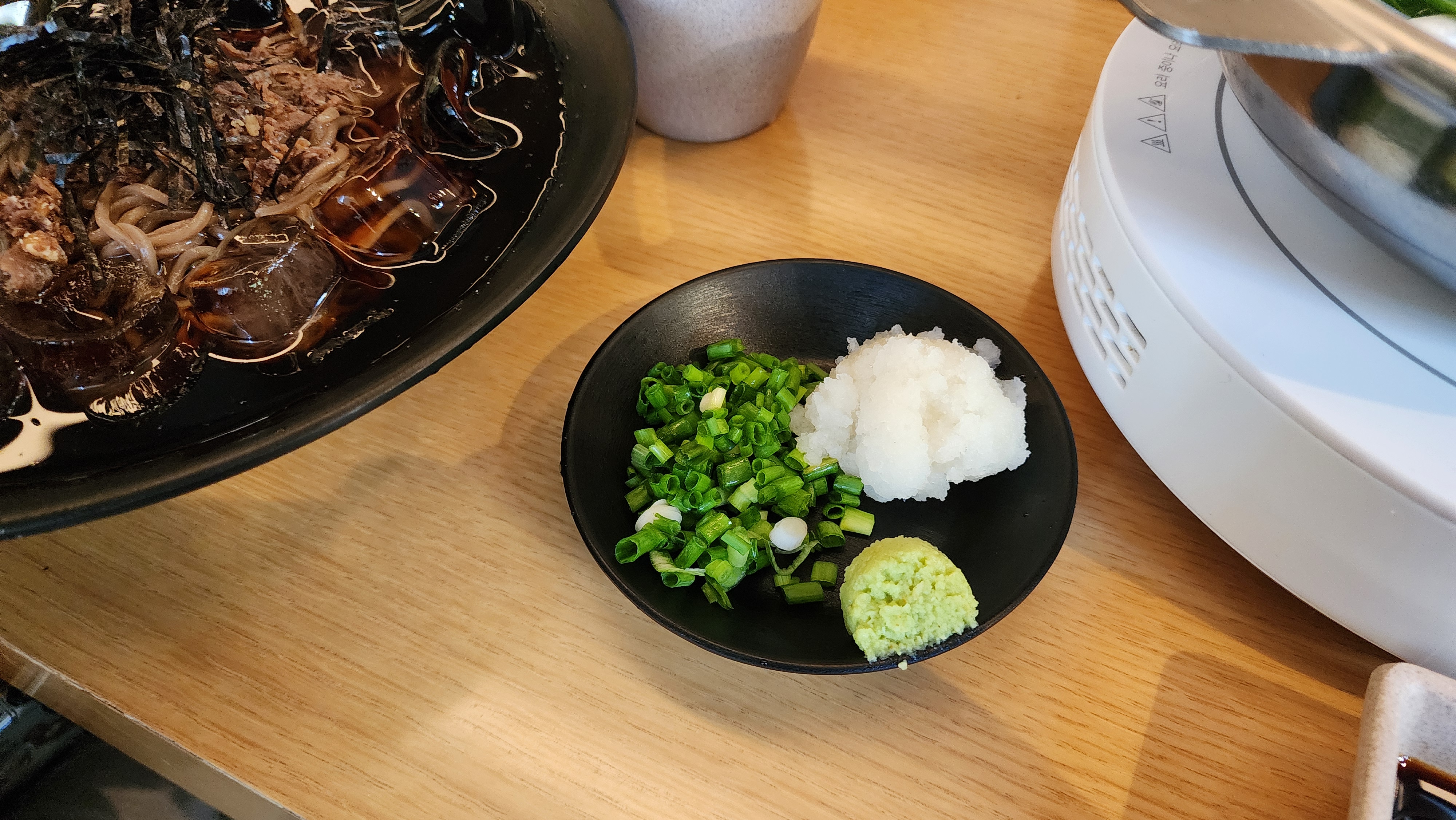 냉모밀에 곁들여 먹을 수 있도록 쪽파와 간무, 와사비도 같이 나왔어요.