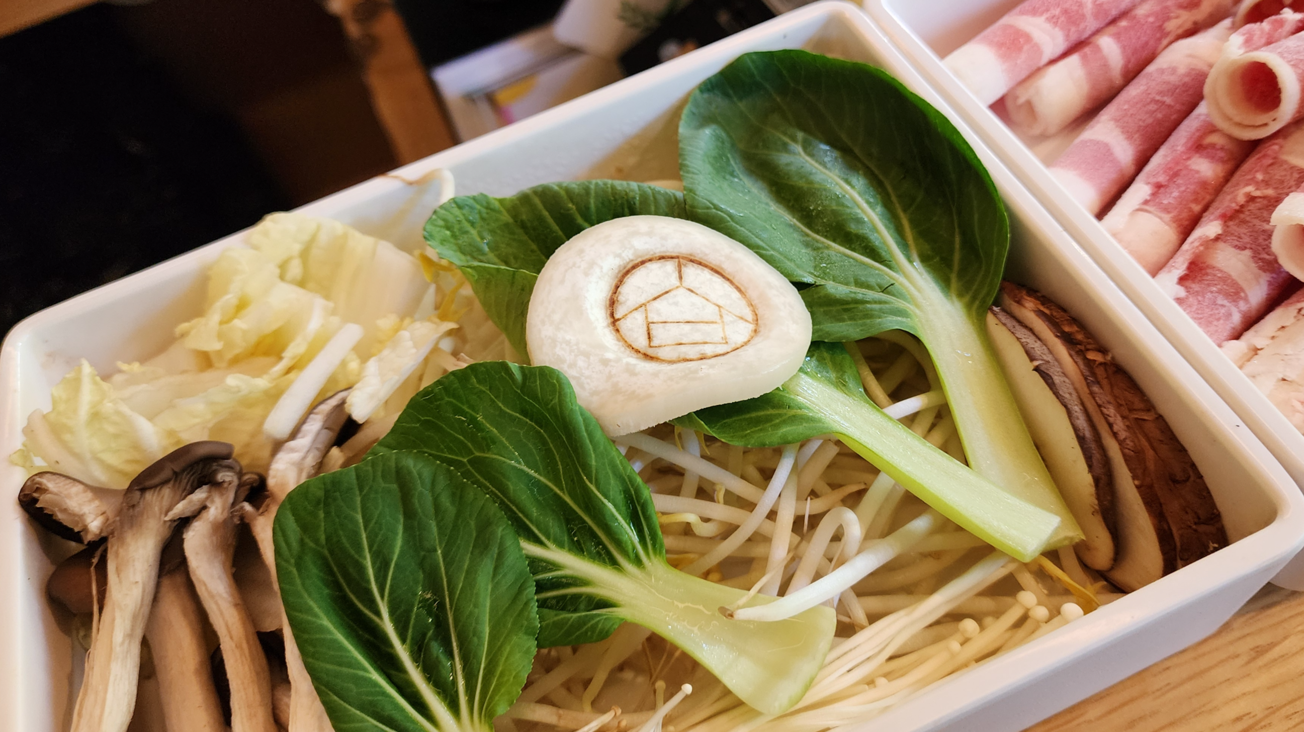 채소도 버섯, 청경채, 알배추, 숙주, 팽이버섯이 골고루 있었는데요 송이버섯에 로고가 찍혀나오더군요.