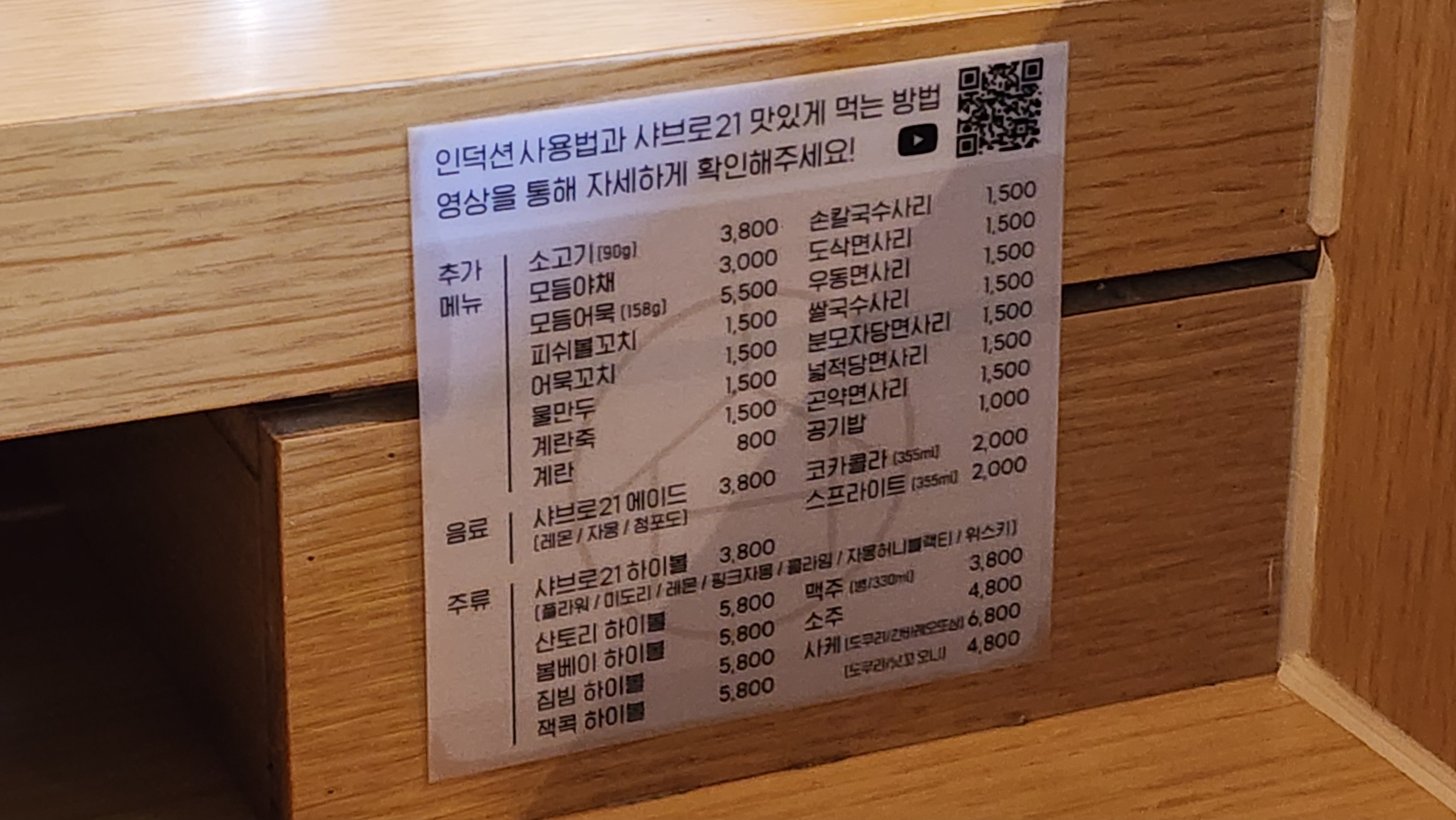 샤브샤브 먹으면서 더 먹을거 없나 볼 수 있게 테이블에 작은 메뉴도 있더군요. 이건 장사의 킥 인것 같았어요.