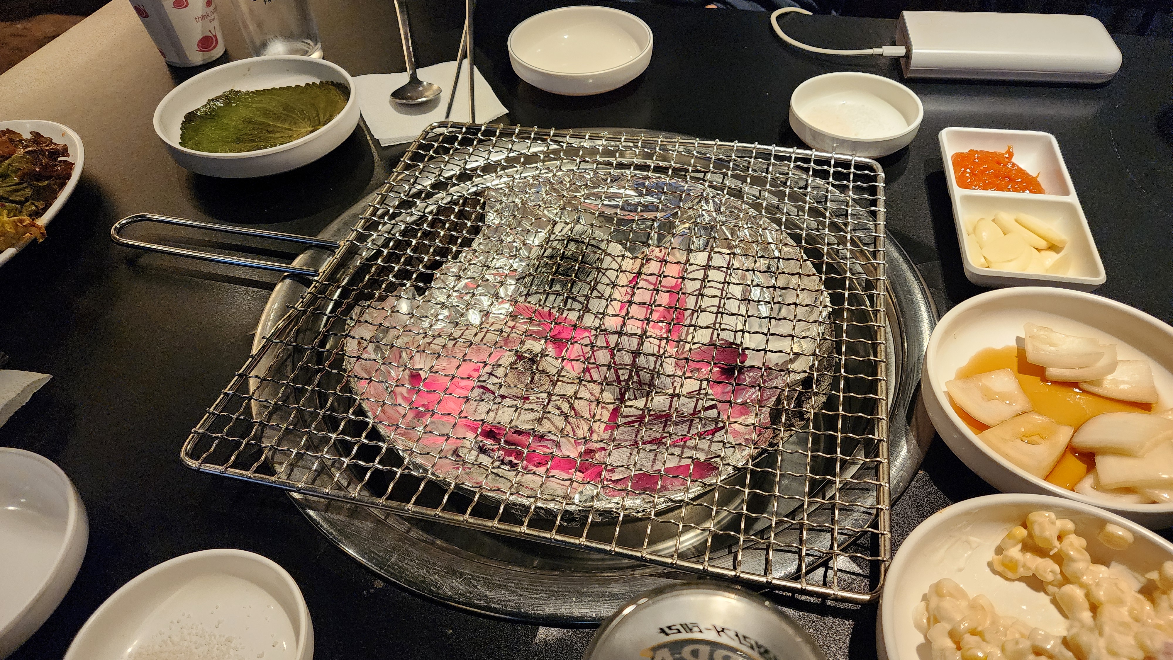 숯불 위에 이렇게 석쇠를 올려주는데 고기를 굽다가 그을어진다 싶으면 바로 갈아주시더라고요.
