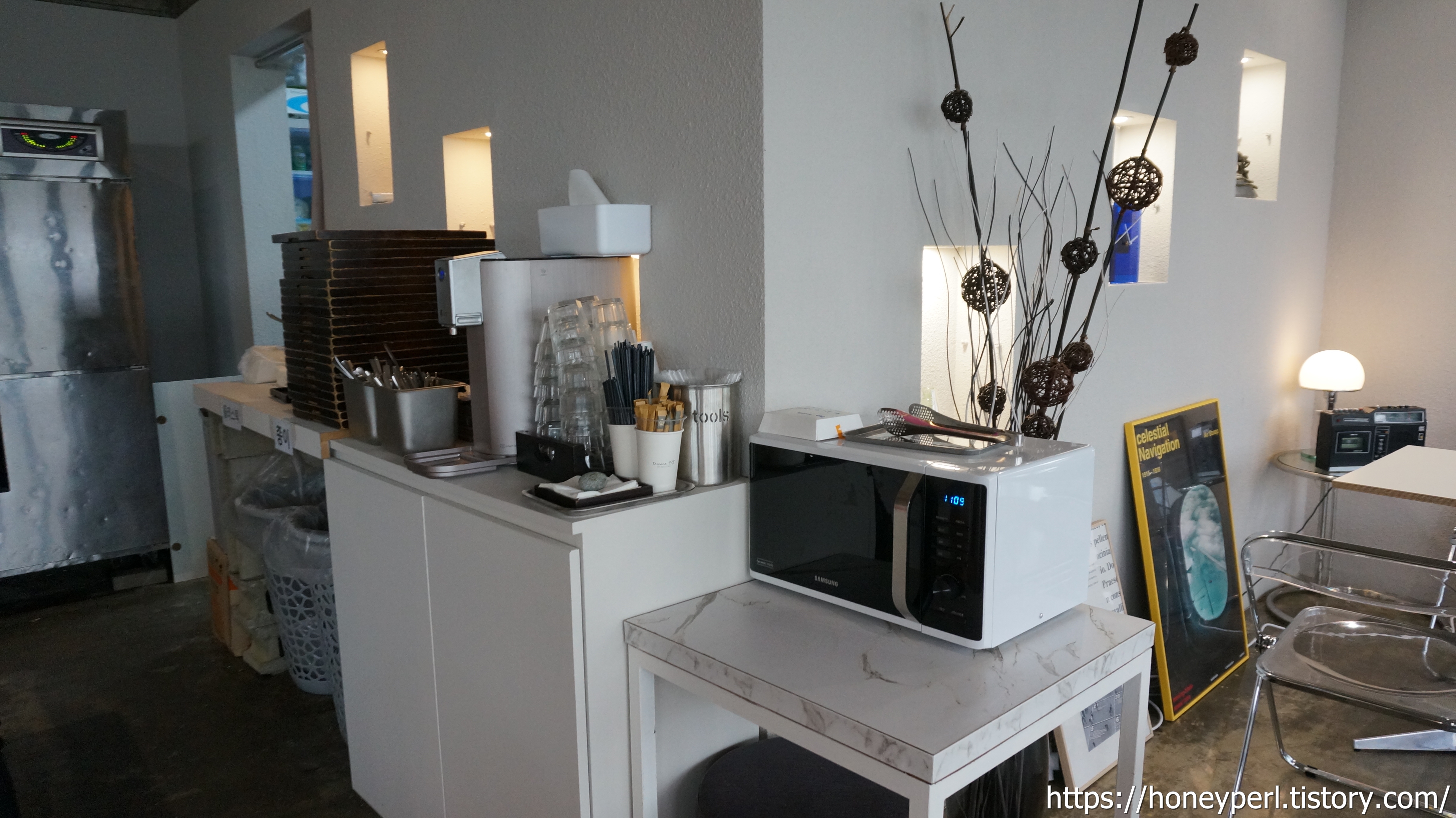 카운터 옆쪽으로 보면 전자렌지, 컵, 정수기, 식기류 등이 구비되어있어 필요한 것들을 챙겨갈 수 있도록 되어있었어요.