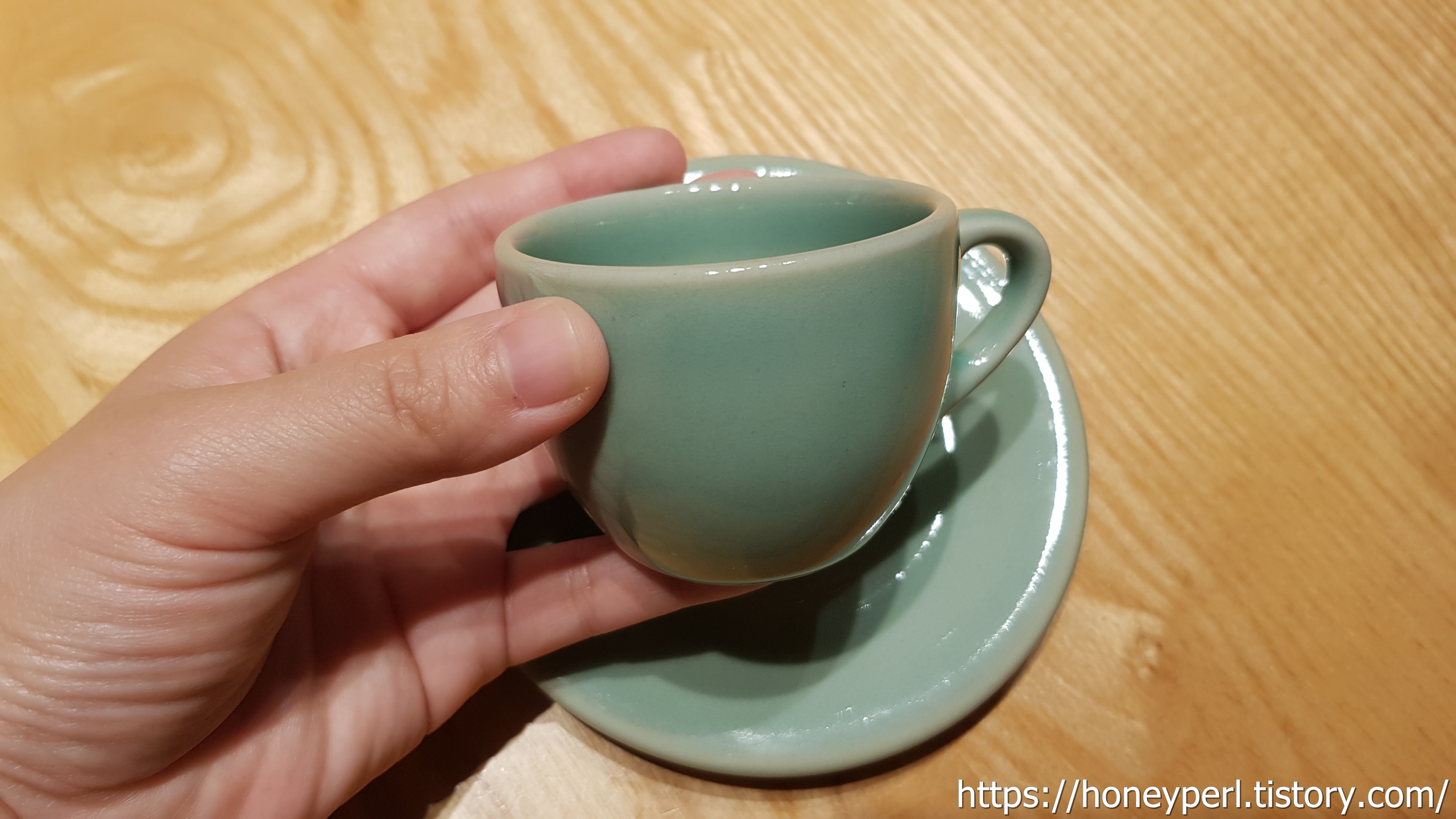 마인드리추얼에서 구매할 수 있는 강진청자 에스프레소잔이었는데 청자의 오묘한 빛깔이 참 아름답더군요.