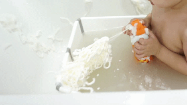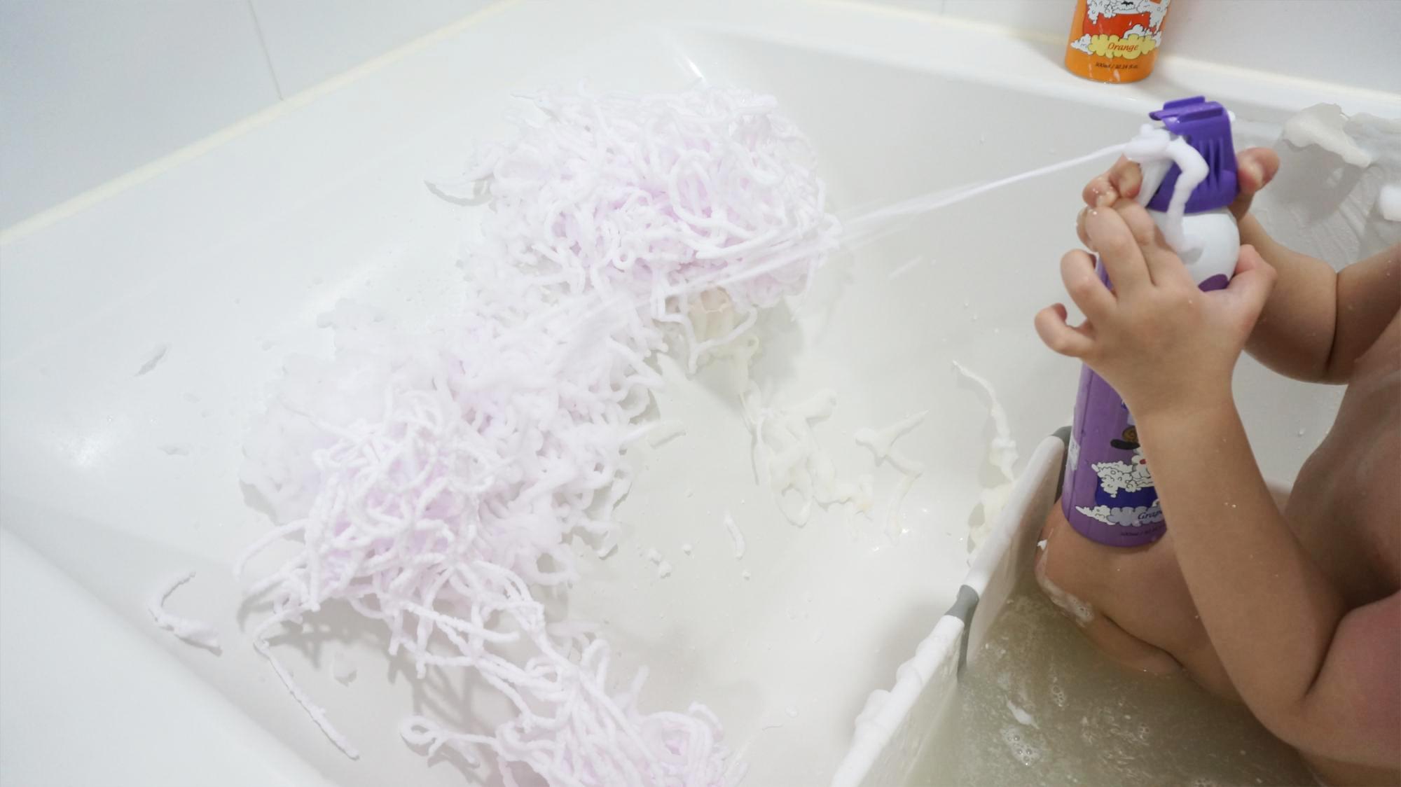 거품이 단단해서 목욕놀이 컵에 채워 넣고 그 위에 또 컵으로 누르는 놀이도 재미있었어요.