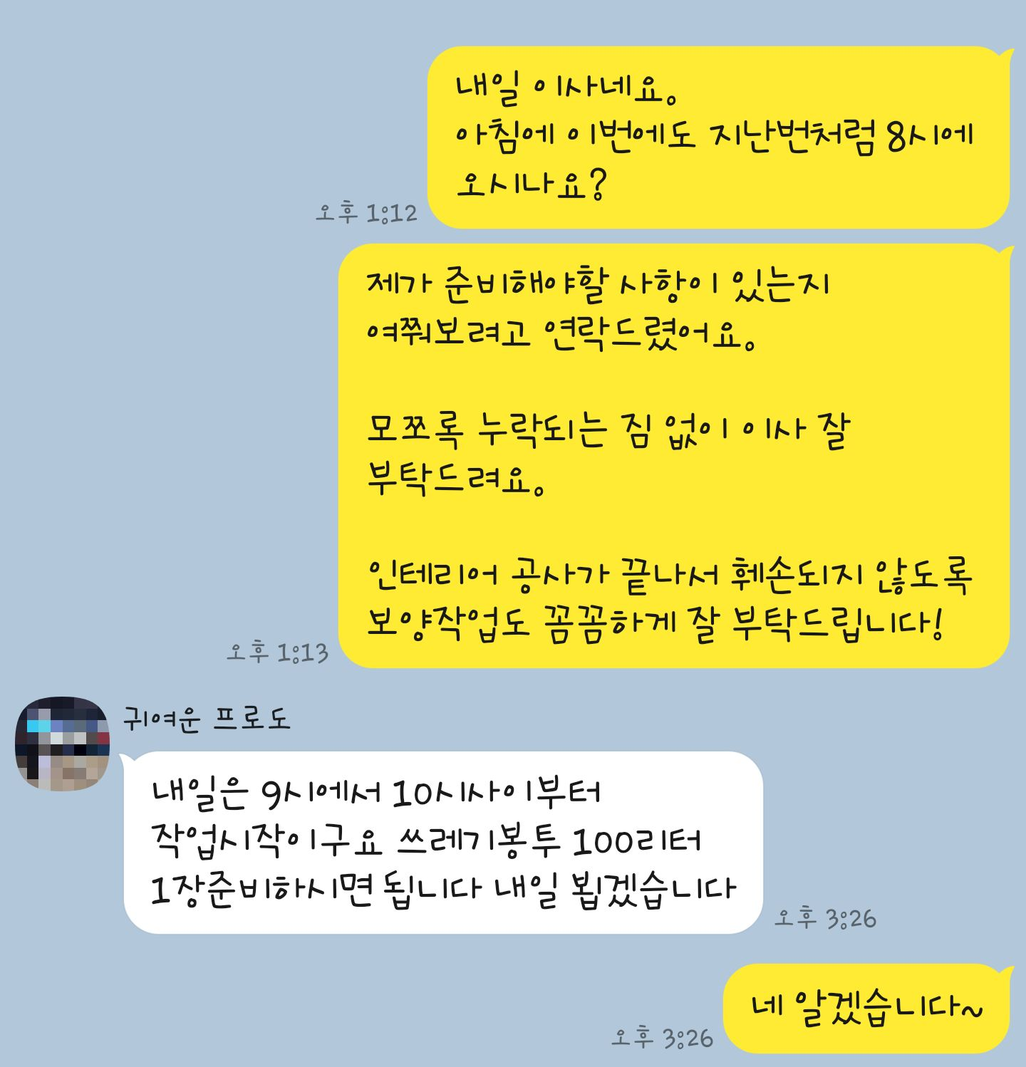 이사 전날 이사팀 담당자 분께 카톡으로 연락을 드렸었어요.