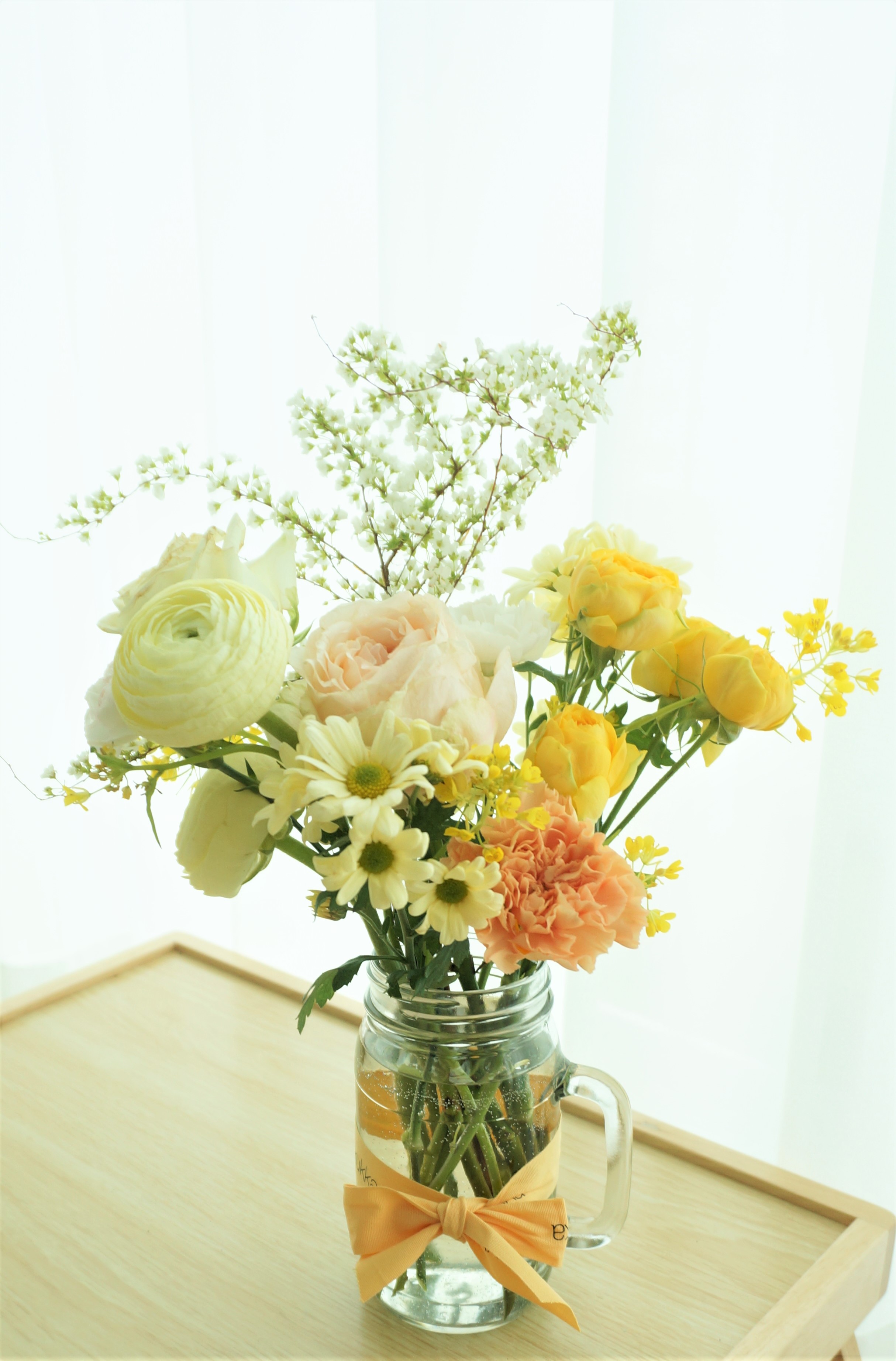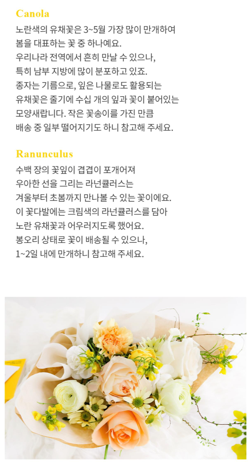 유채꽃의 꽃말은 쾌활, 크림 라넌큘러스의 꽃말은 매력 이라네요.