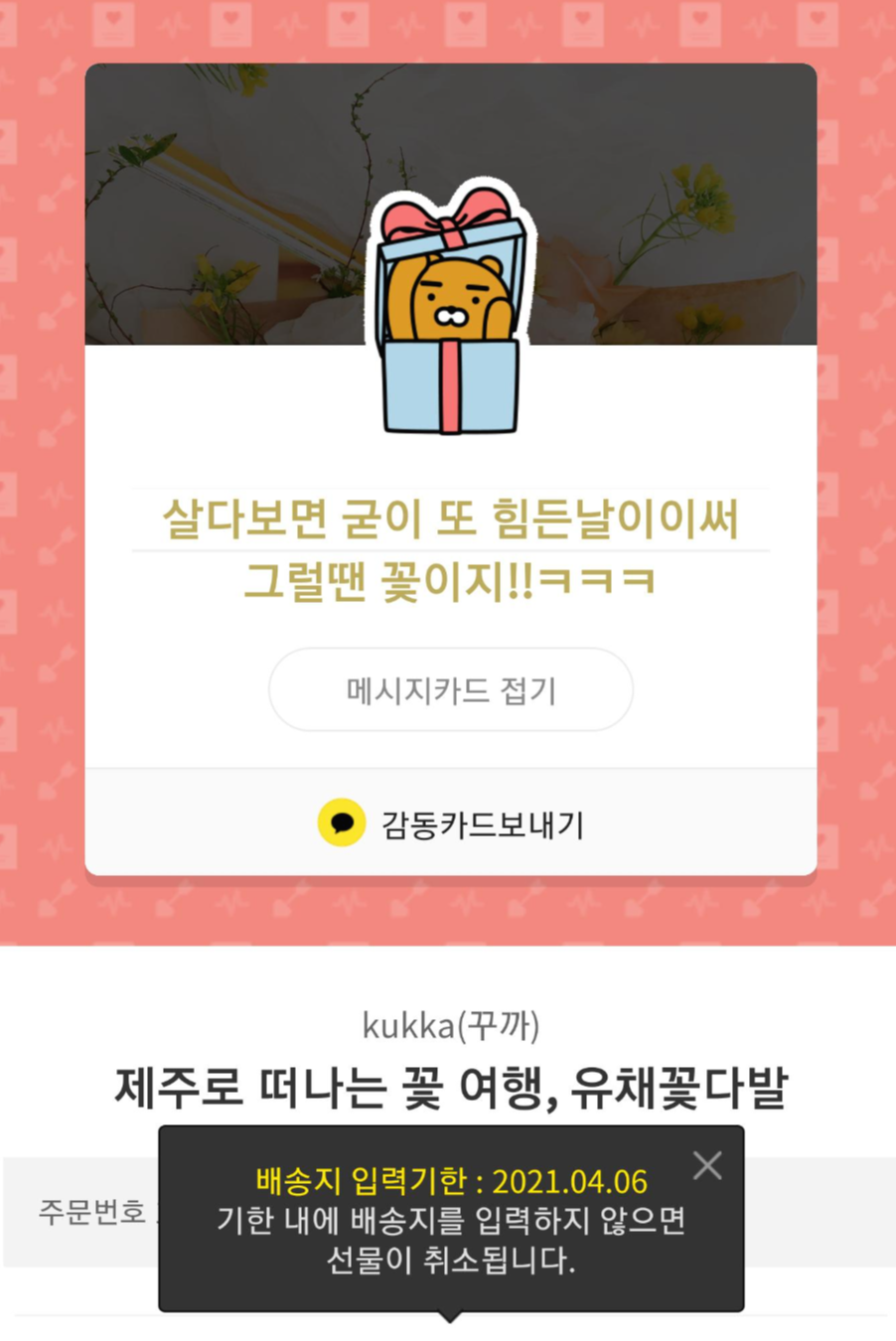 꽃다발이 배송되어 온 건 배송지 입력하고 다다음날 이었어요.