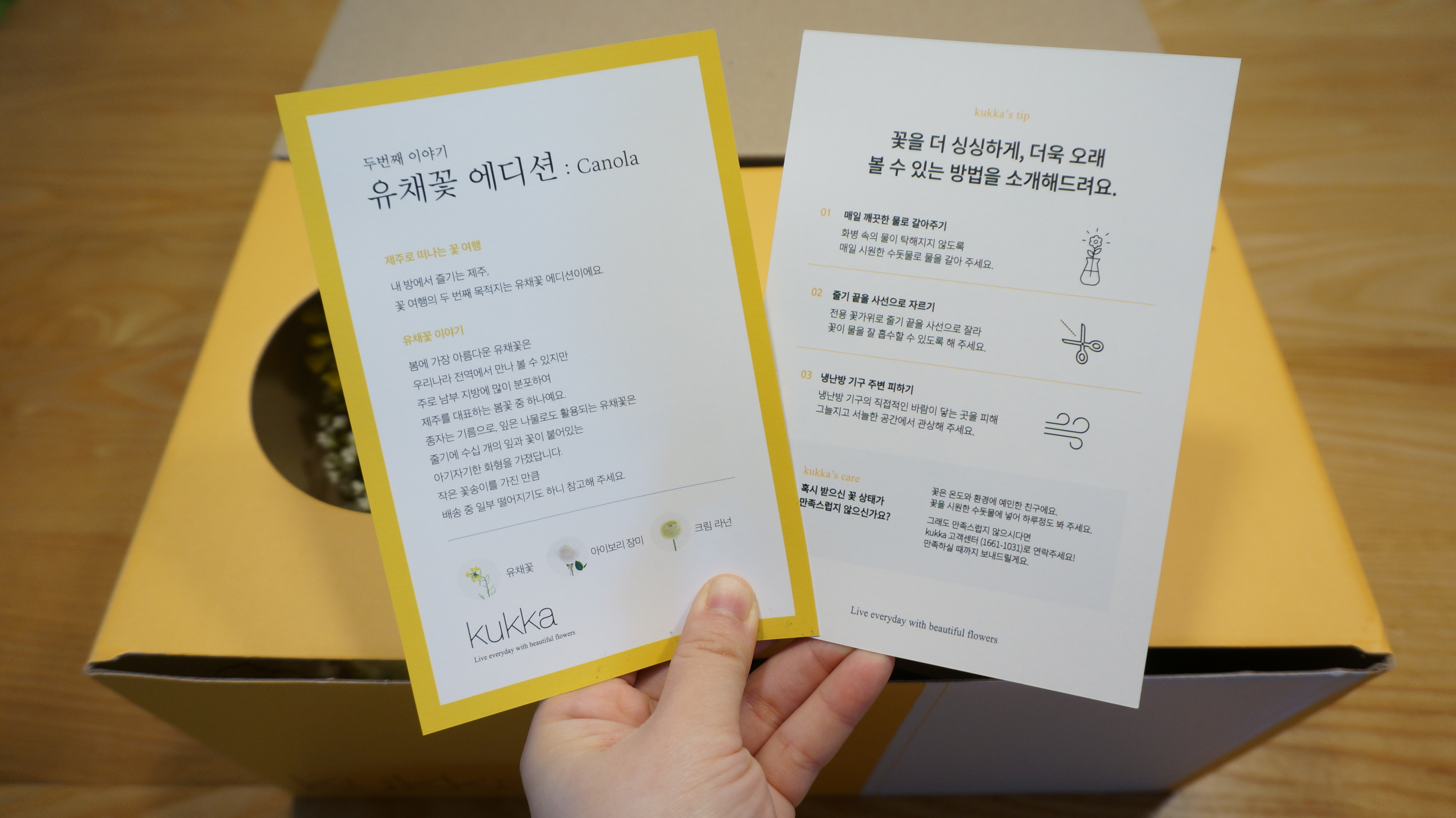 내 방에서 즐기는 제주 컨셉인 유채꽃 에디션에 대한 설명과 꽃을 더 싱싱하게 오래 볼 수 있는 방법에 대한 안내가 적혀있었어요.