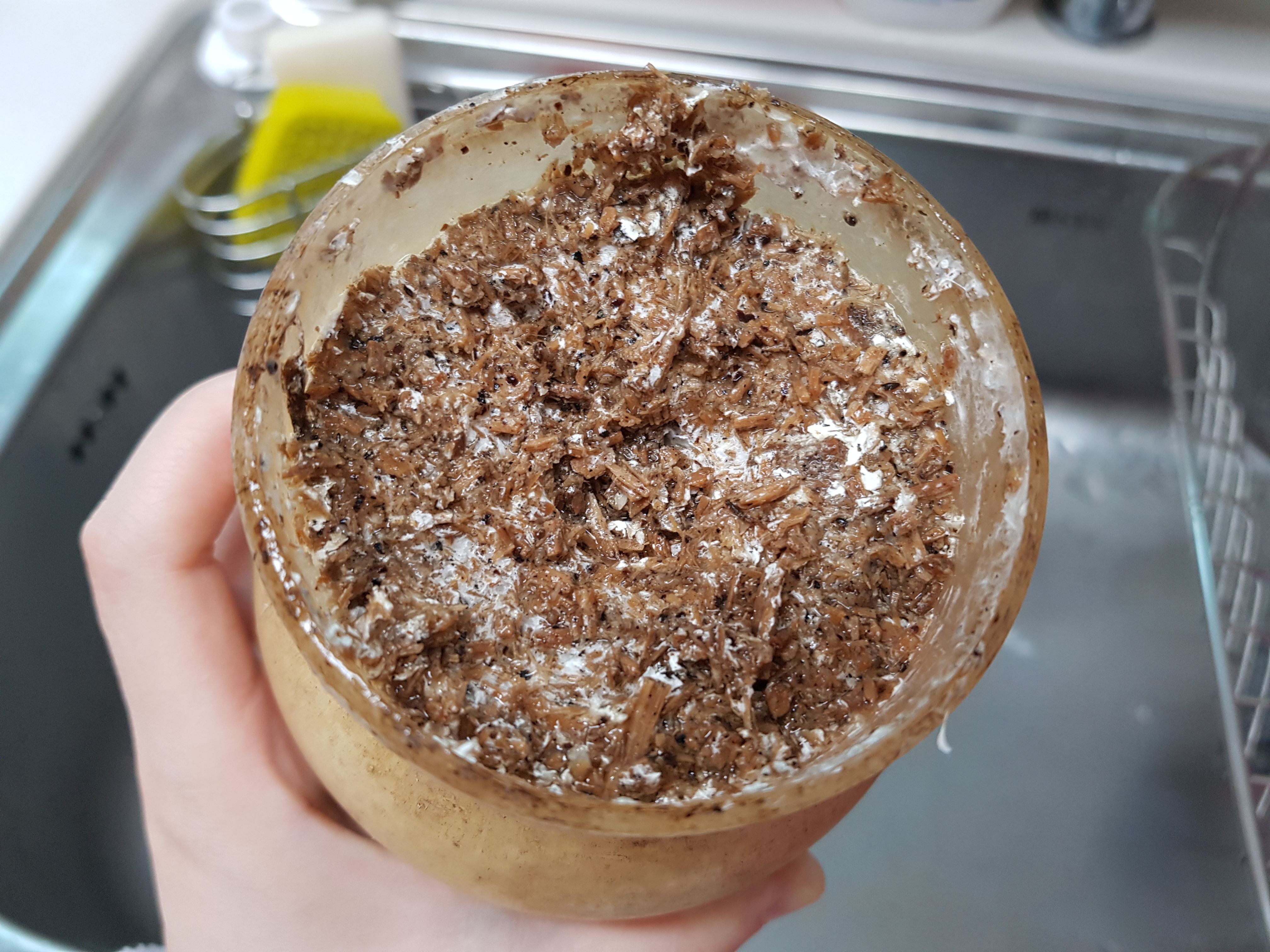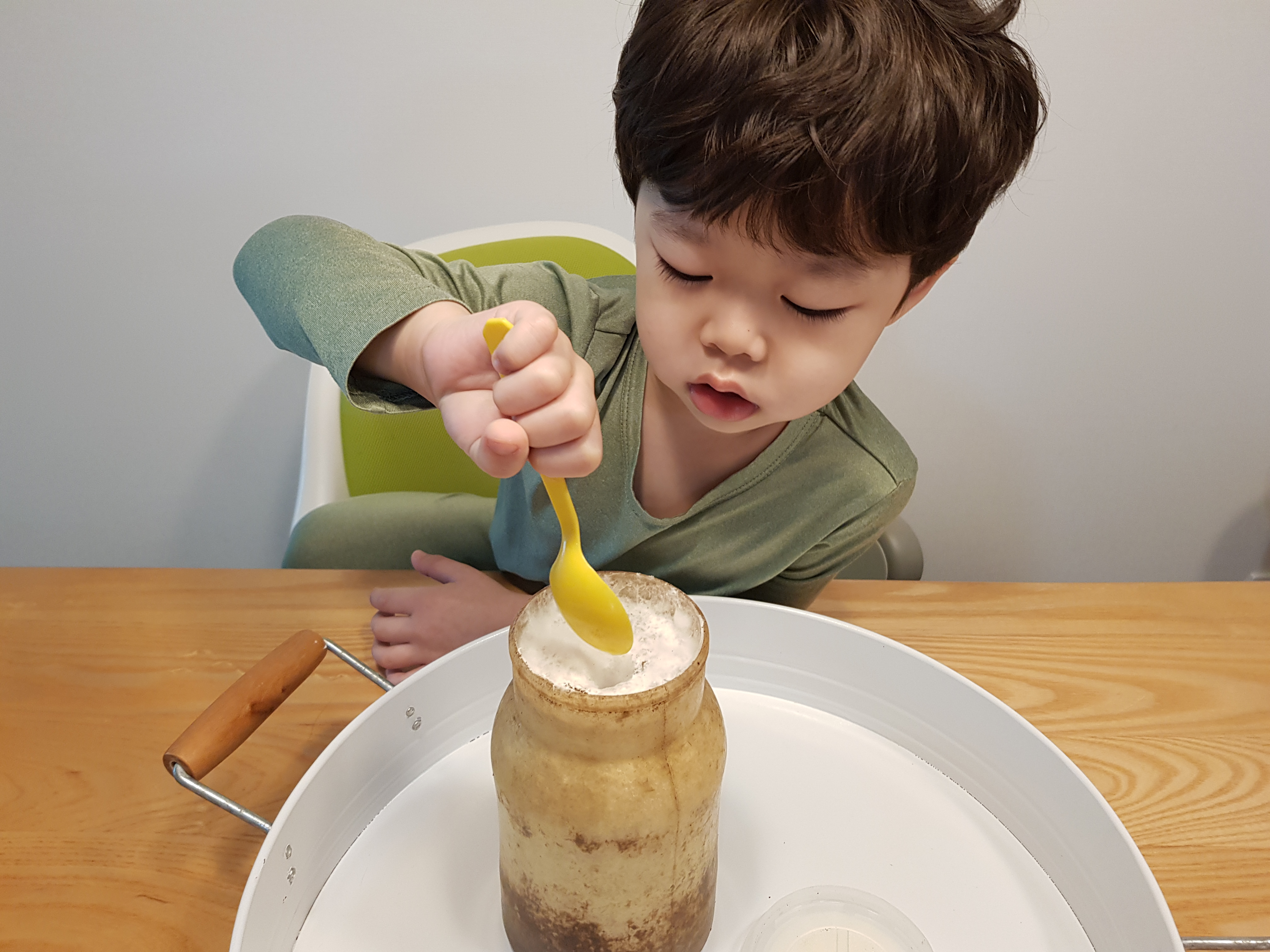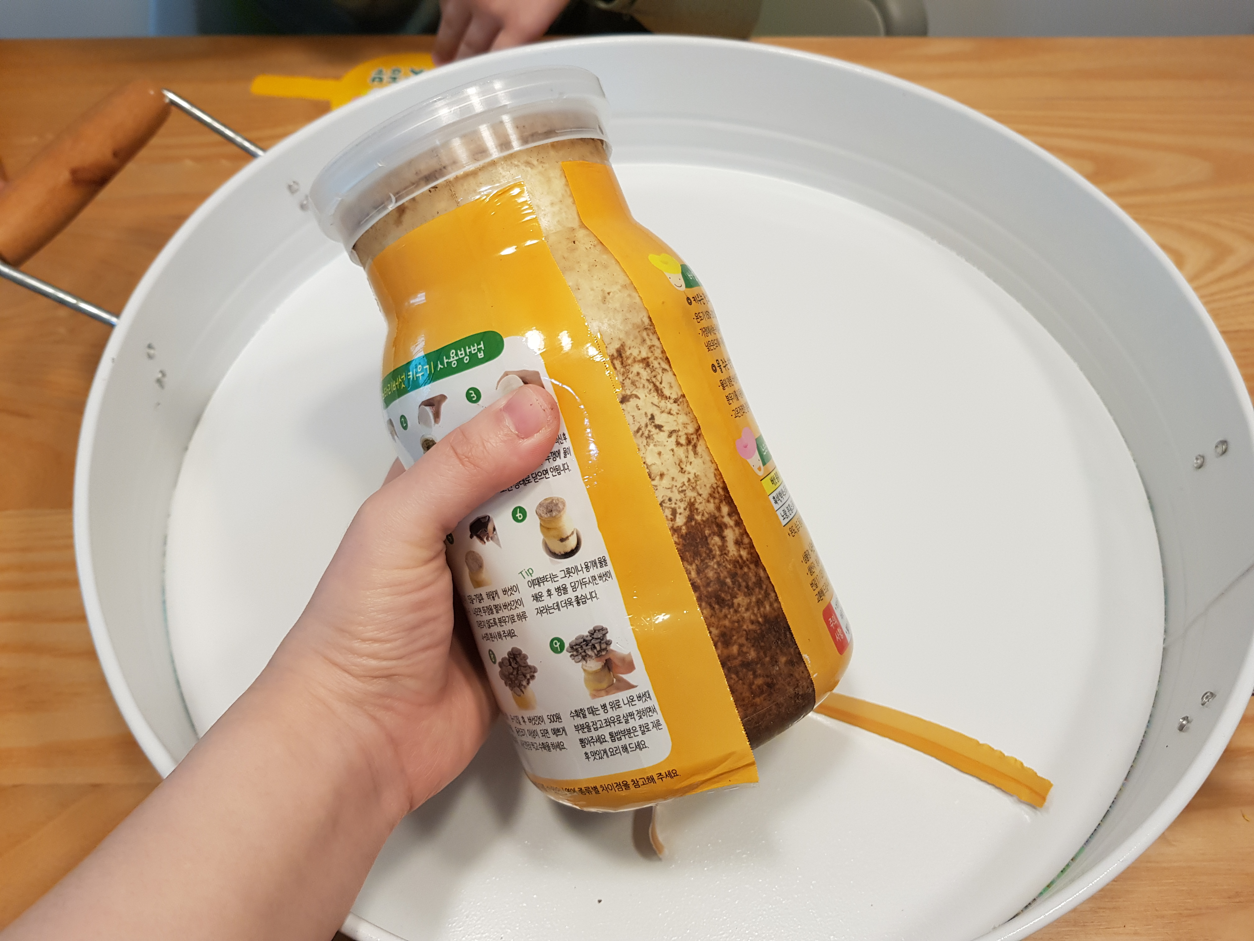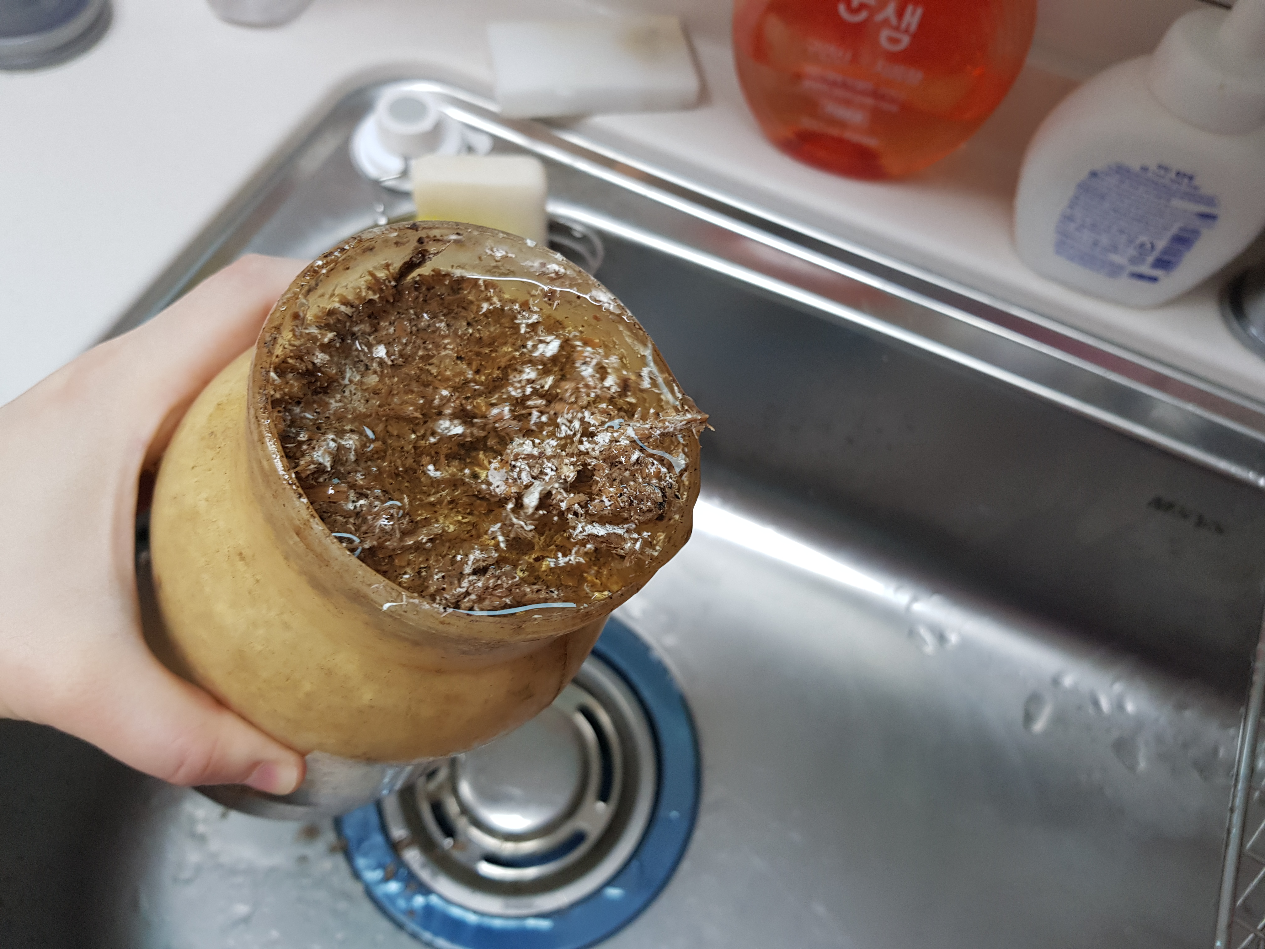 병뚜껑을 열고 하얀 노화균 포면을 숟가락으로 1cm정도 긁어주기