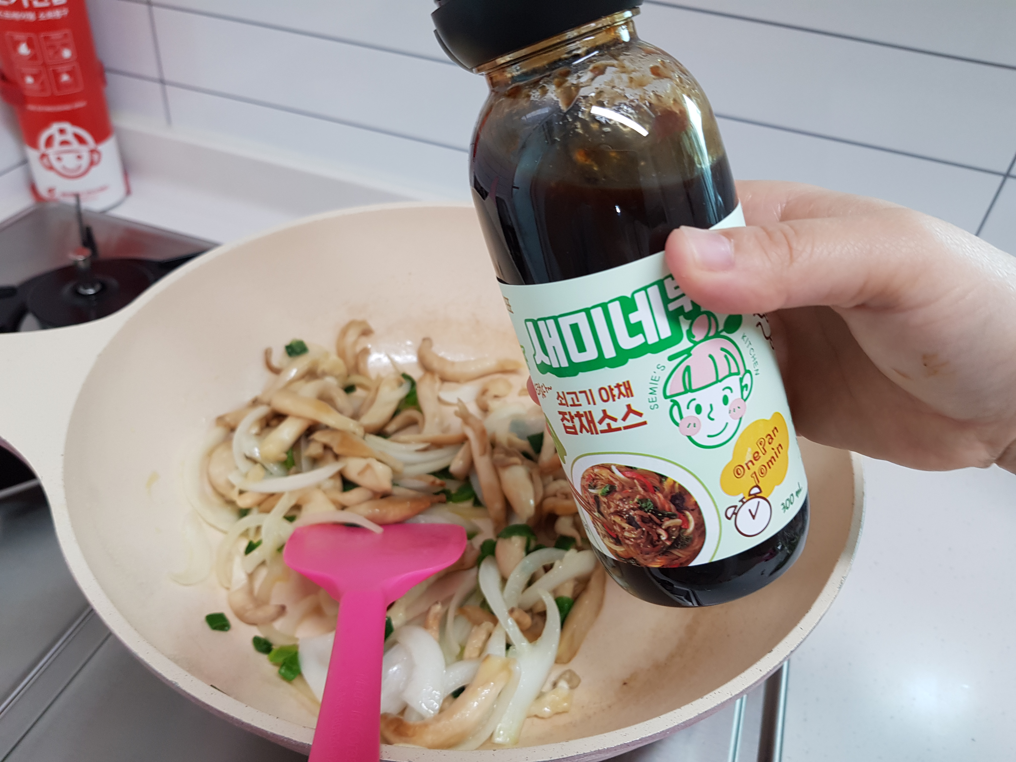버섯볶음 양념으로는 새미네부엌 쇠고기야채잡채소스 휘리릭 둘러 신나게 볶아볶아 주었어요.
