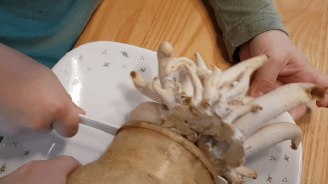 설명에는 버섯 아랫부분을 잡고 좌우로 젖혀 빼면 된다고 나와있었는데 저는 톱밥도 귀찮고 해서 동글이에게 빵칼 주고 잘라 수확하도록 했어요.
