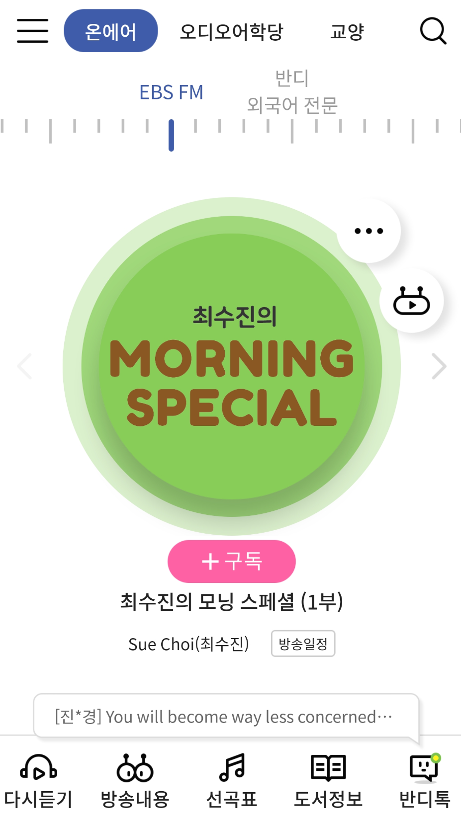 EBS FM 104.5MHz 나 반디앱에서 들으실 수 있어요.