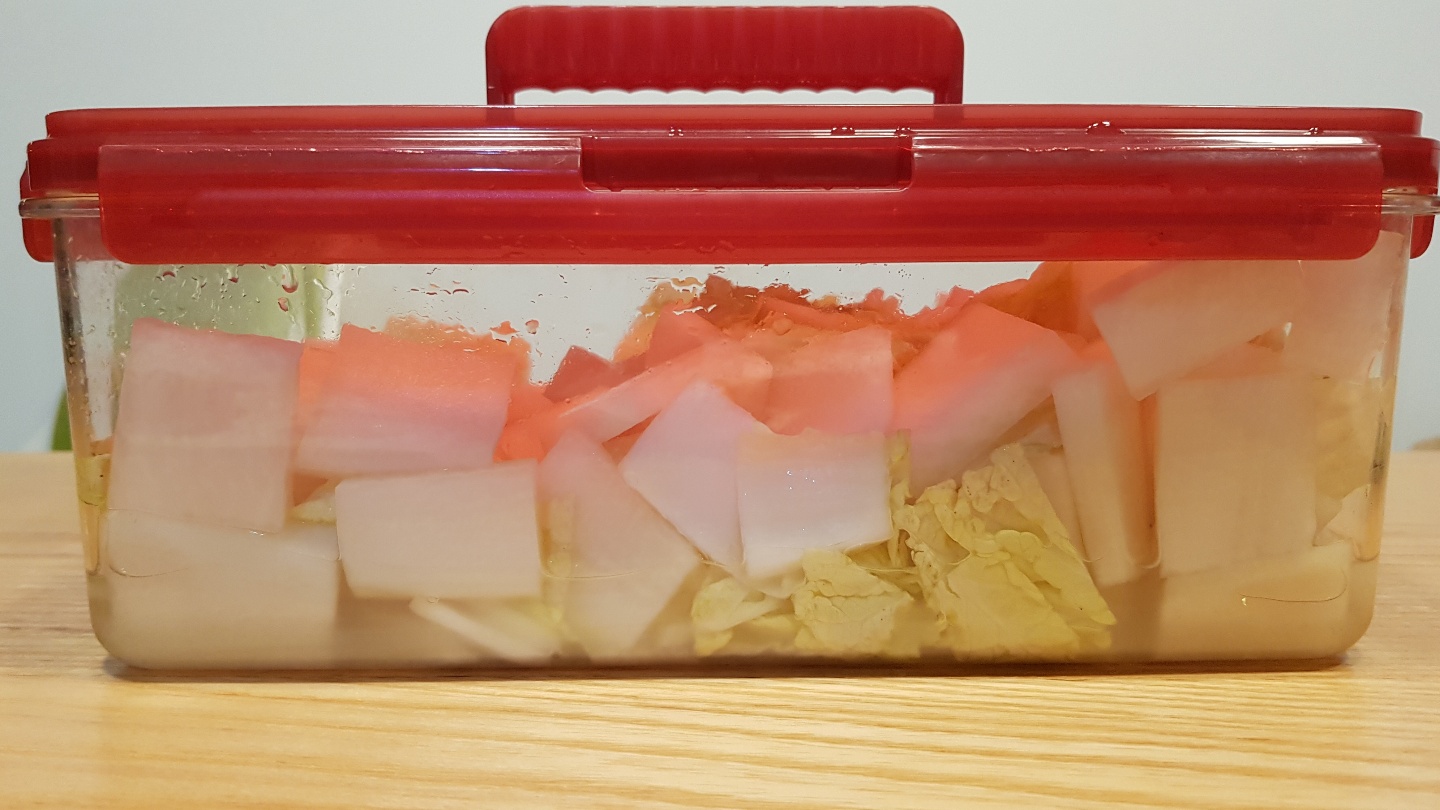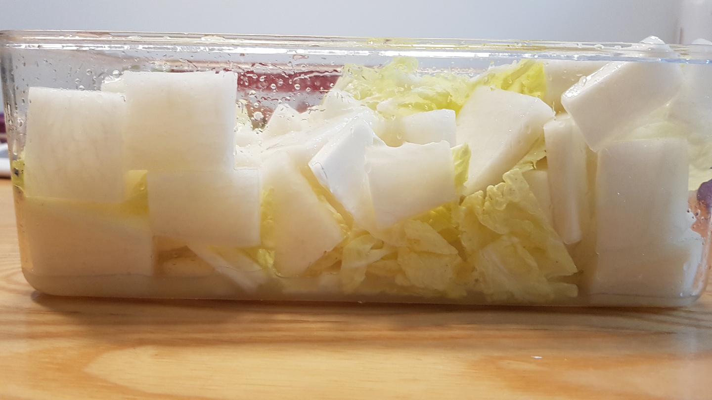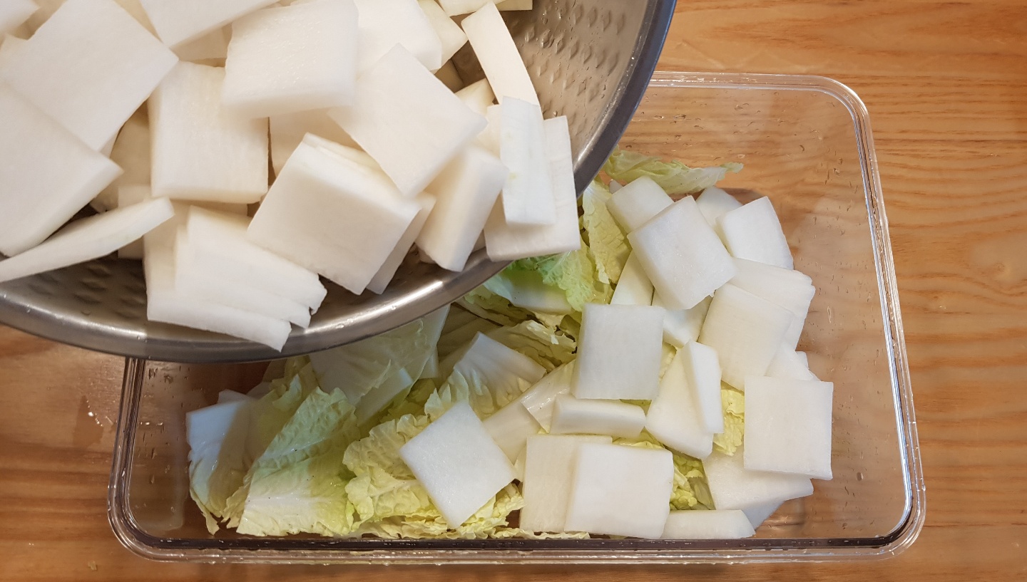 무게 개량해 둔 알배추와 무를 김치통에 담고