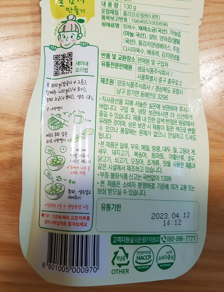 양념 패키지가 너무 귀엽죠? 뒷면에 간단한 레시피가 나와있고 QR코드로도 요리법을 볼 수 있어요.