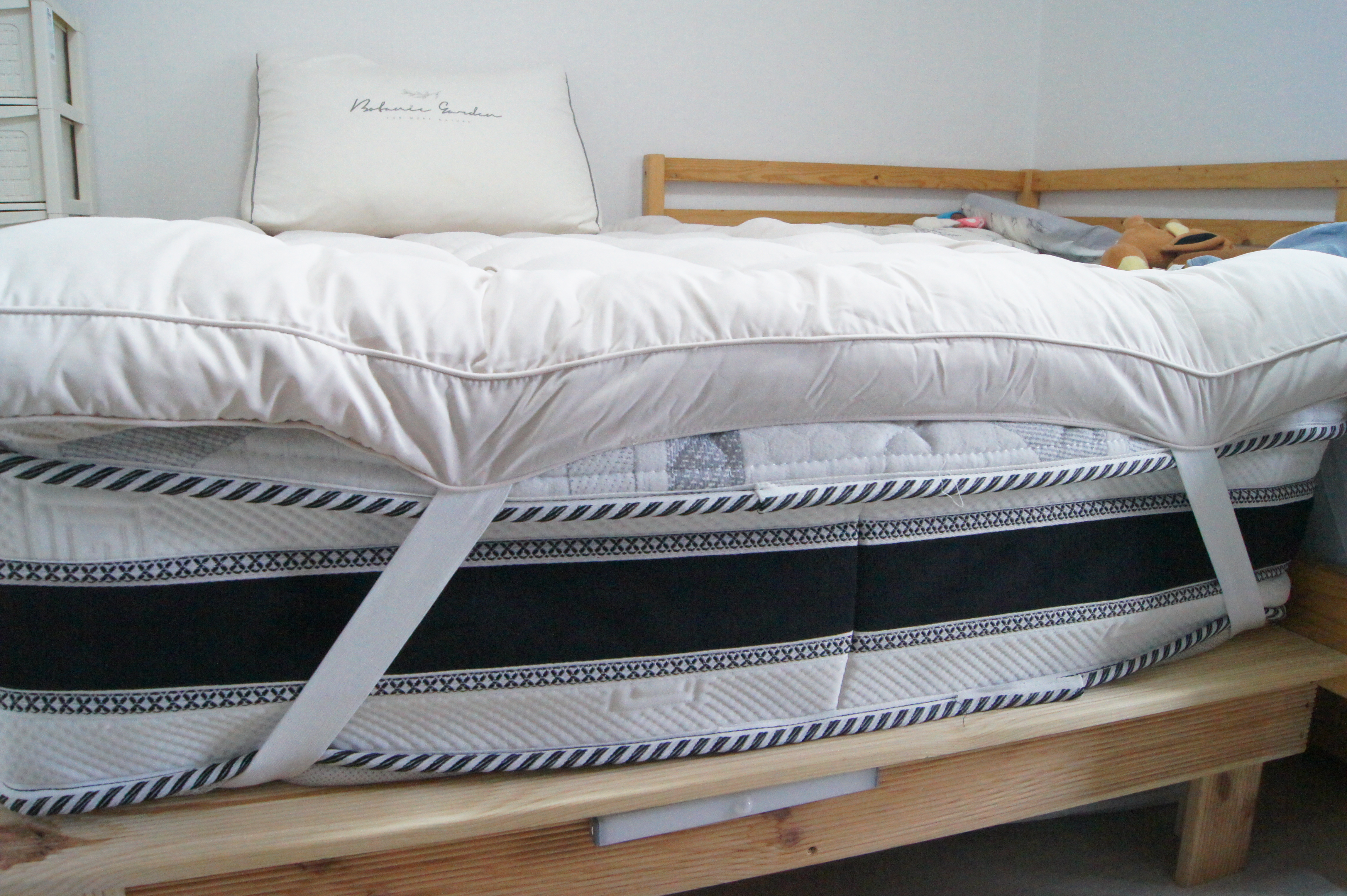 아이방 침대 매트리스에 누잠 토퍼 가 설치된 모습이예요.